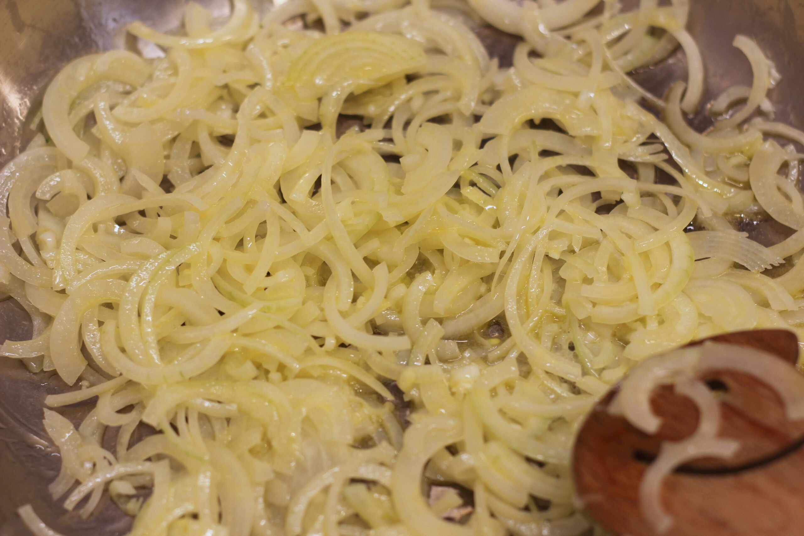 Eine Pfanne* bei mittlerer Hitze erwärmen. Die Butter schmelzen und die Zwiebeln darin glasig anschwitzen.