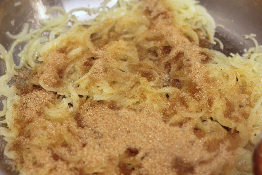 Zucker hinzugeben und eine Minute erhitzen, dann mit dem Essig ablöschen. 2 Minuten reduzieren lassen und die Rinderbrühe einrühren. Nelken, Wacholderbeeren, Lorbeerblätter und Sultaninen einrühren und 5 Minuten simmern lassen.