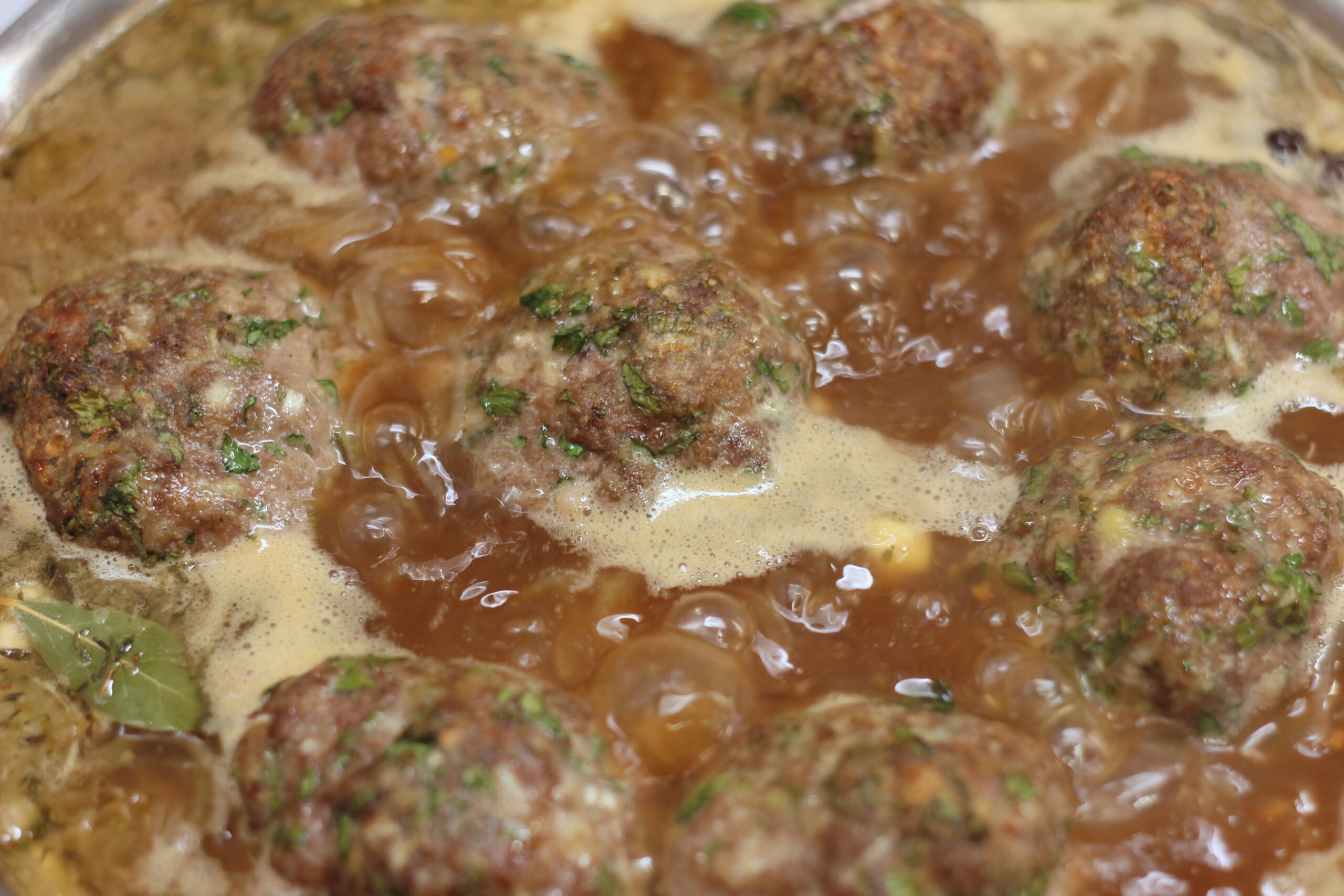 Jetzt Mehl und Liège Sirup einrühren und mit Salz und Pfeffer abschmecken. Die gegarten Boulets einlegen und 10 Minuten simmern lassen.