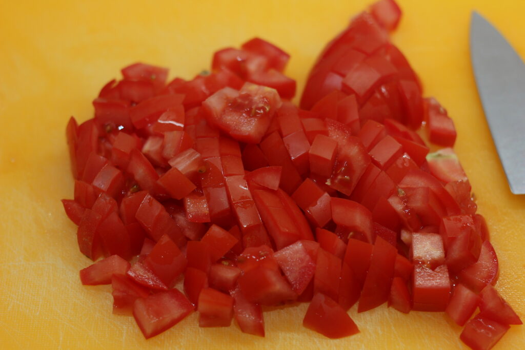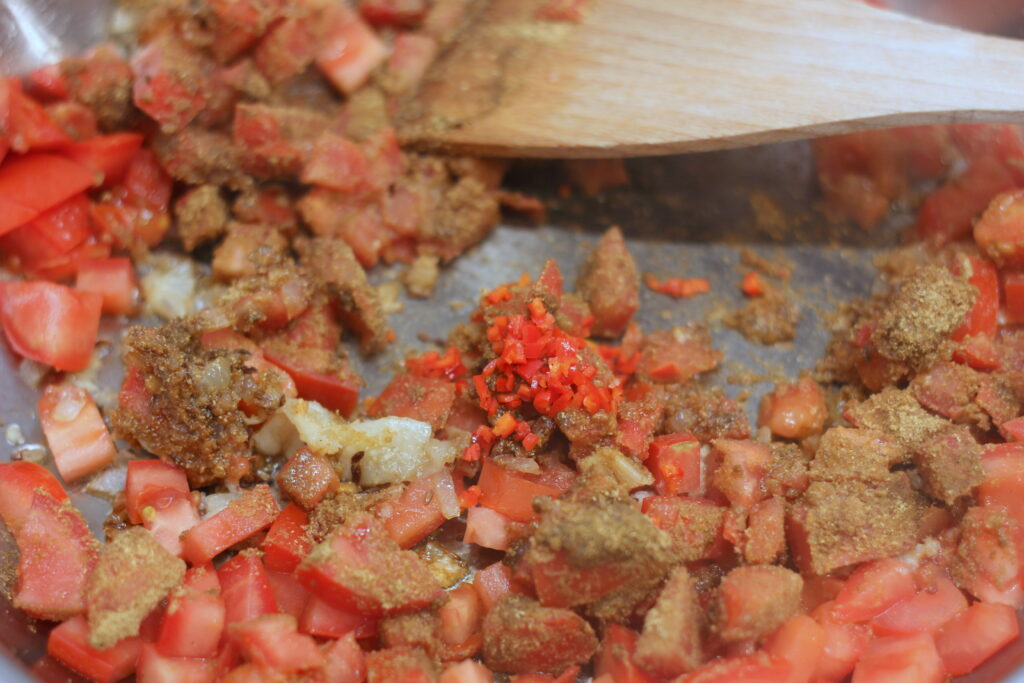 Jetzt Tomaten, Koriander und gemahlenen Kreuzkümmel sowie Chili hinzugeben.