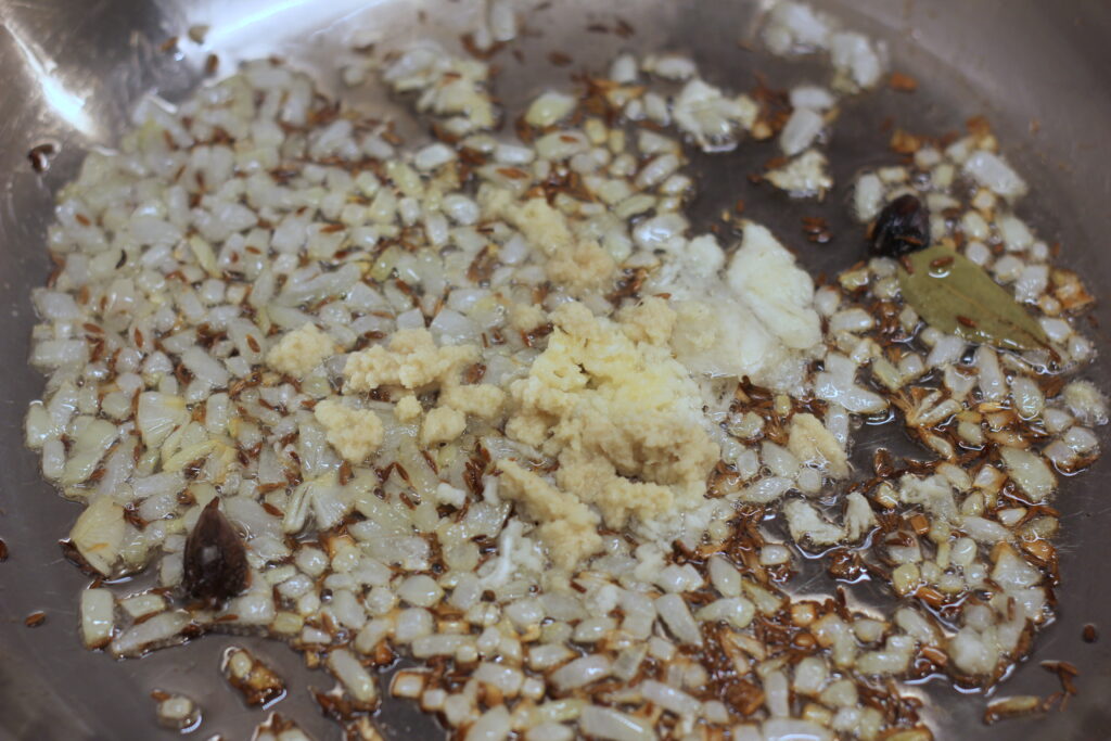 Eine Pfanne* mit etwas Öl bei mittlerer Hitze erwärmen. Die ganzen Kreuzkümmelsamen, die Kardamomkapseln und das Lorbeerblatt leicht anrösten. Die Zwiebeln mit einer Prise Salz hinzugeben und etwas braun werden lassen. Knoblauch und Ingwer unterrühren und ebenfalls kurz anschwitzen.