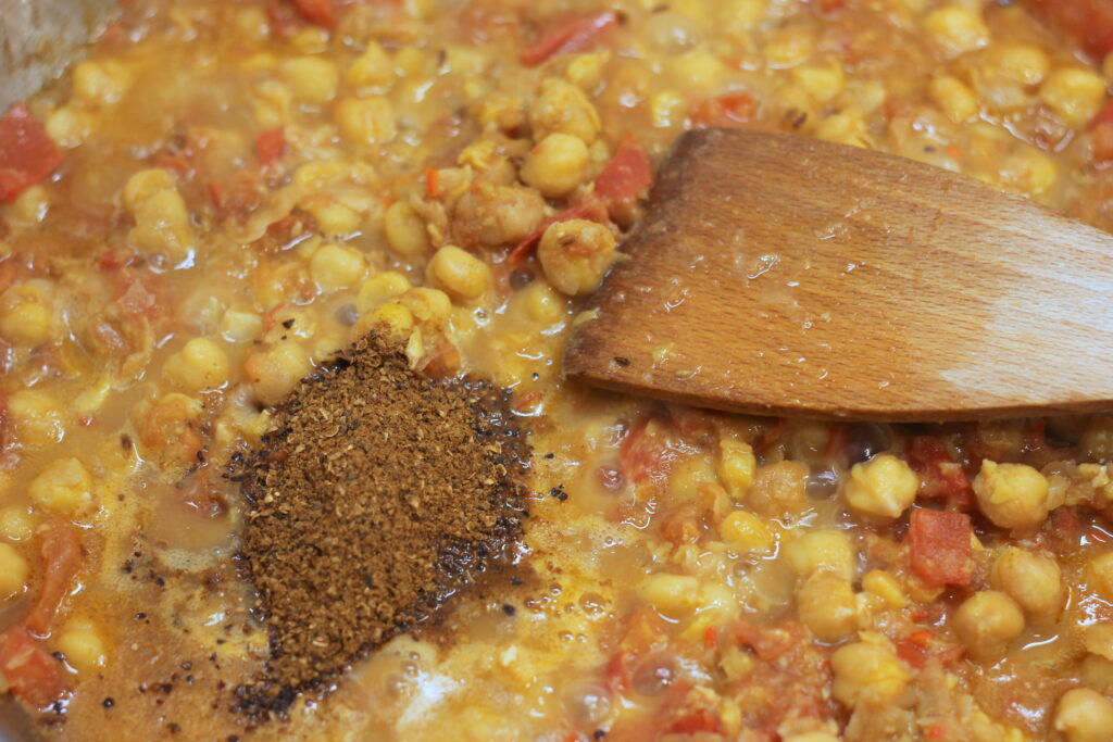 Köcheln lassen, bis die Masse eindickt, dann die Kichererbsen und etwa 250 ml Wasser einrühren. Alles aufkochen, dann abgedeckt 10 Minuten köcheln lassen, währenddessen gelegentlich umrühren. Mit einem Kartoffelstampfer* einige Kichererbsen zerdrücken und nach Geschmack mit Wasser verdünnen.