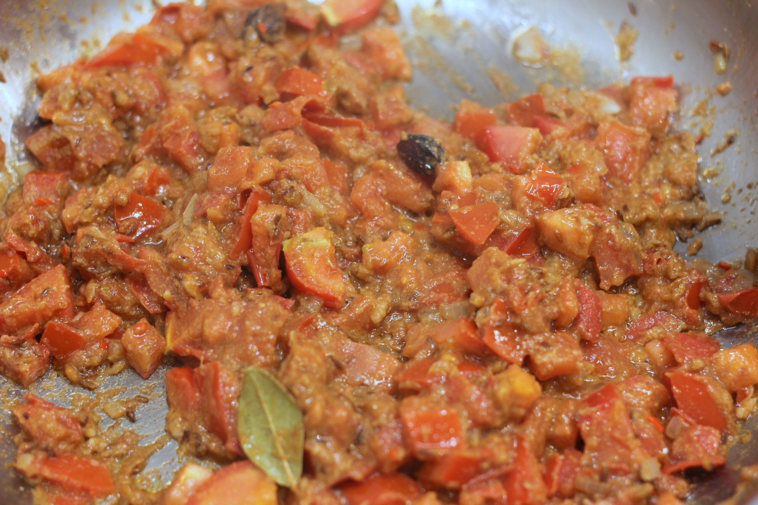 Jetzt Tomaten, Koriander und gemahlenen Kreuzkümmel sowie Chili hinzugeben.