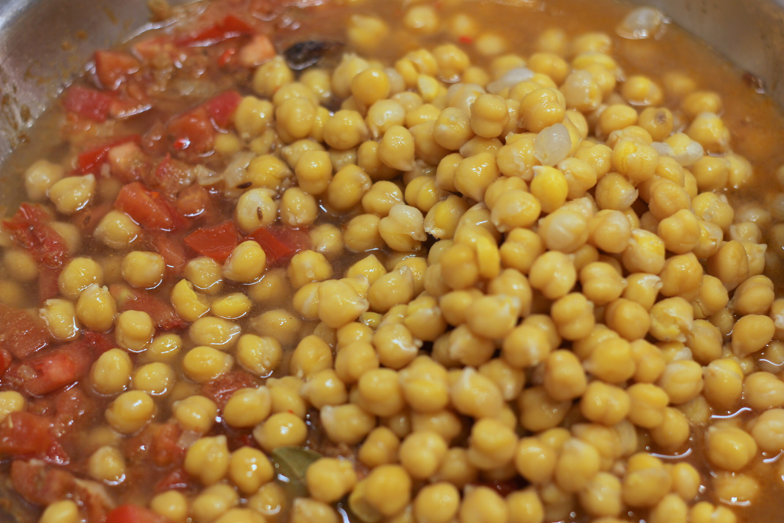 Köcheln lassen, bis die Masse eindickt, dann die Kichererbsen und etwa 250 ml Wasser einrühren. Alles aufkochen, dann abgedeckt 10 Minuten köcheln lassen, währenddessen gelegentlich umrühren. Mit einem Kartoffelstampfer* einige Kichererbsen zerdrücken und nach Geschmack mit Wasser verdünnen.
