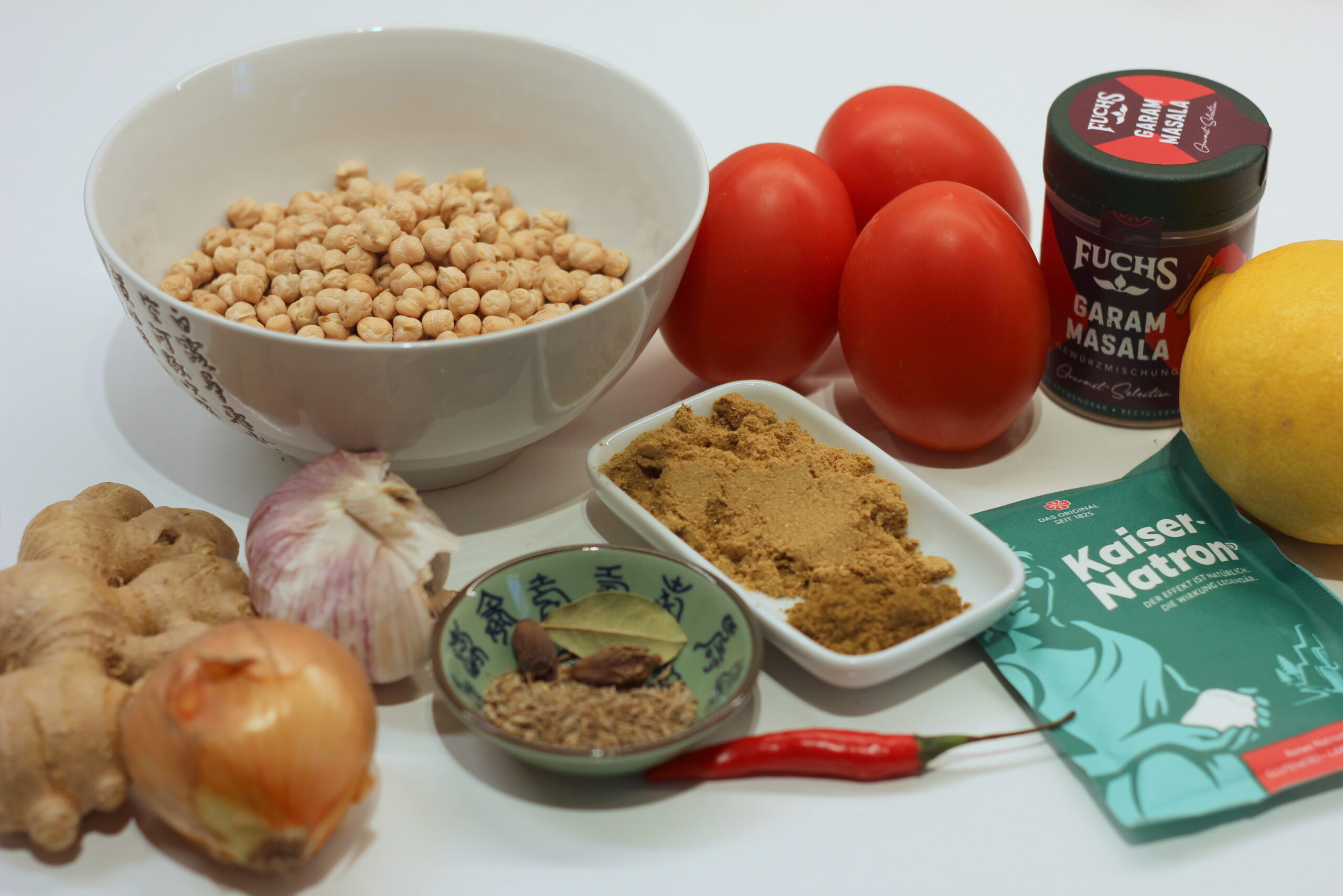 Chana Masala setzt sich aus den beiden Hindi-Worten Chana („Kichererbsen“) und Masala (“Zutaten/Gewürze“) zusammen.