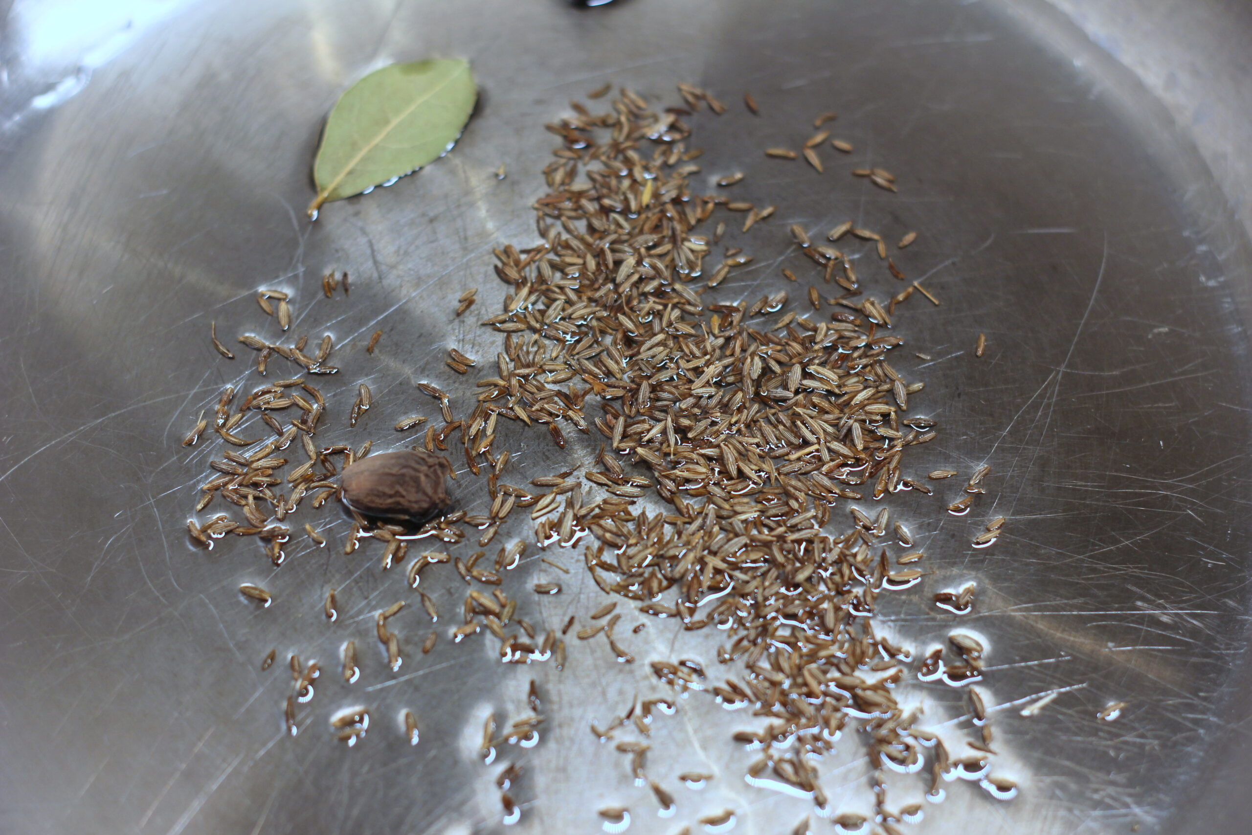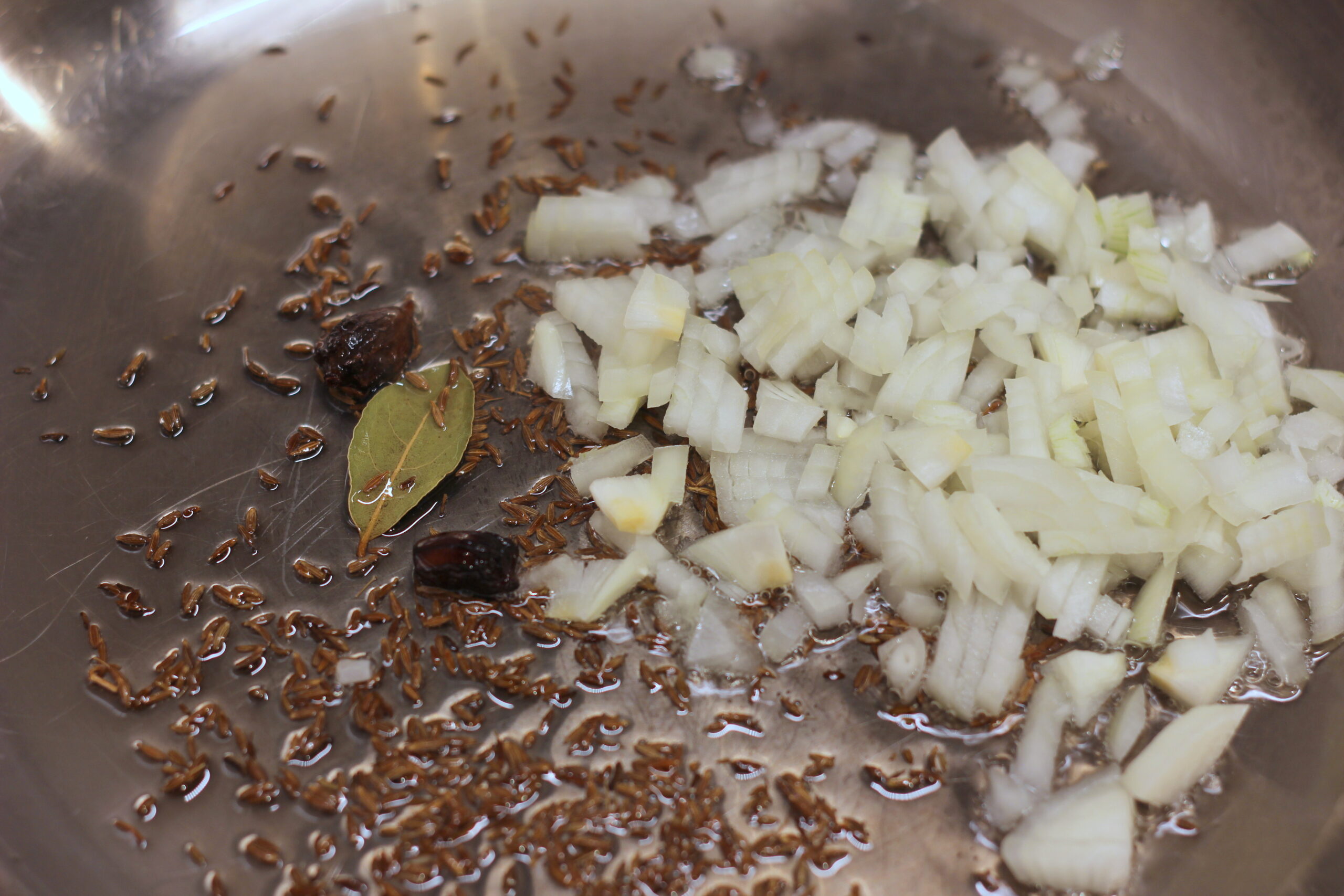 Eine Pfanne* mit etwas Öl bei mittlerer Hitze erwärmen. Die ganzen Kreuzkümmelsamen, die Kardamomkapseln und das Lorbeerblatt leicht anrösten. Die Zwiebeln mit einer Prise Salz hinzugeben und etwas braun werden lassen. Knoblauch und Ingwer unterrühren und ebenfalls kurz anschwitzen.