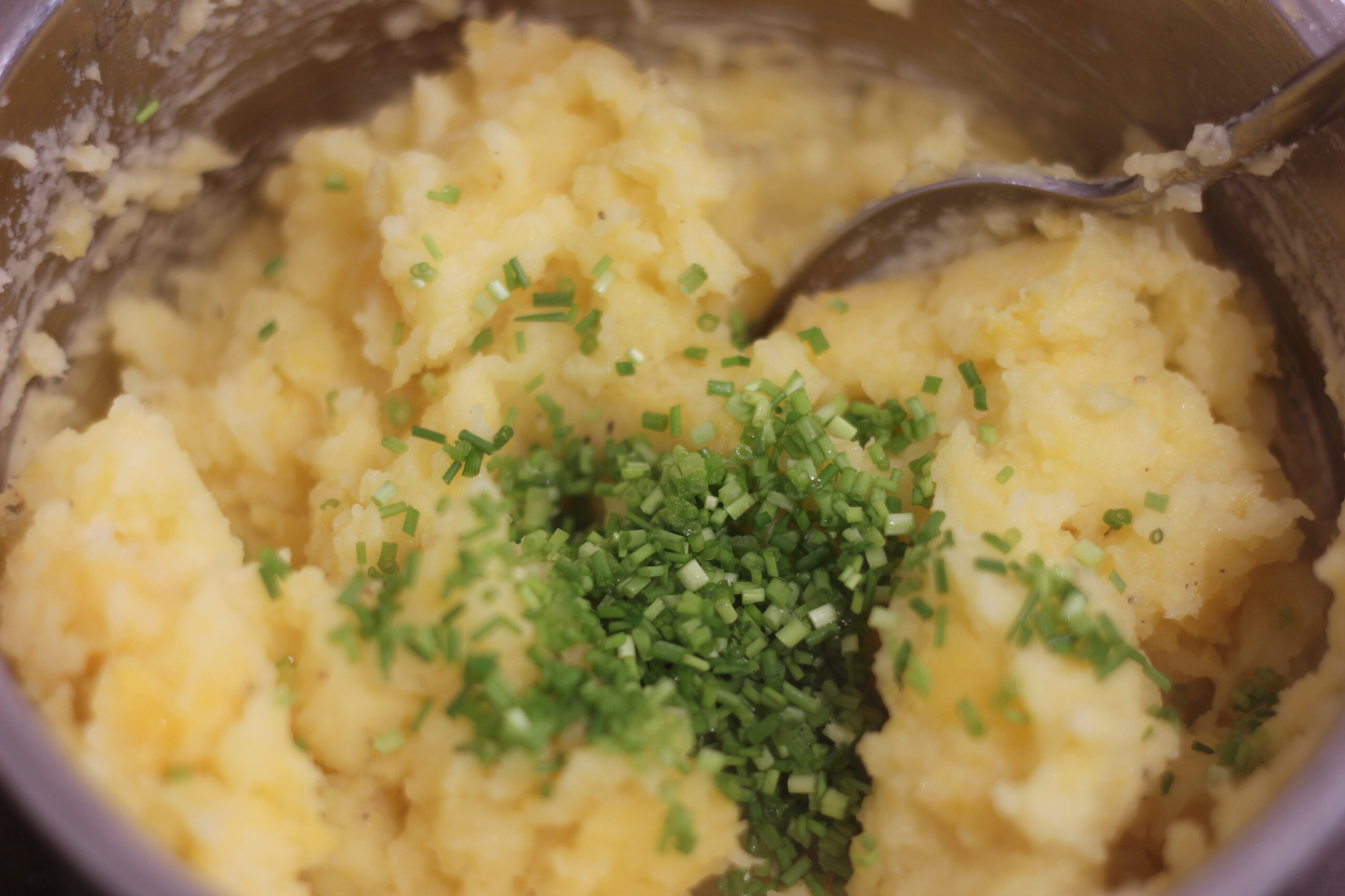 Abgießen, dann Butter und Milch bzw. Sahne hinzugeben und mit dem Kartoffelstampfer* stampfen. Mit Salz und Pfeffer abschmecken, Schnittlauch unterrühren.