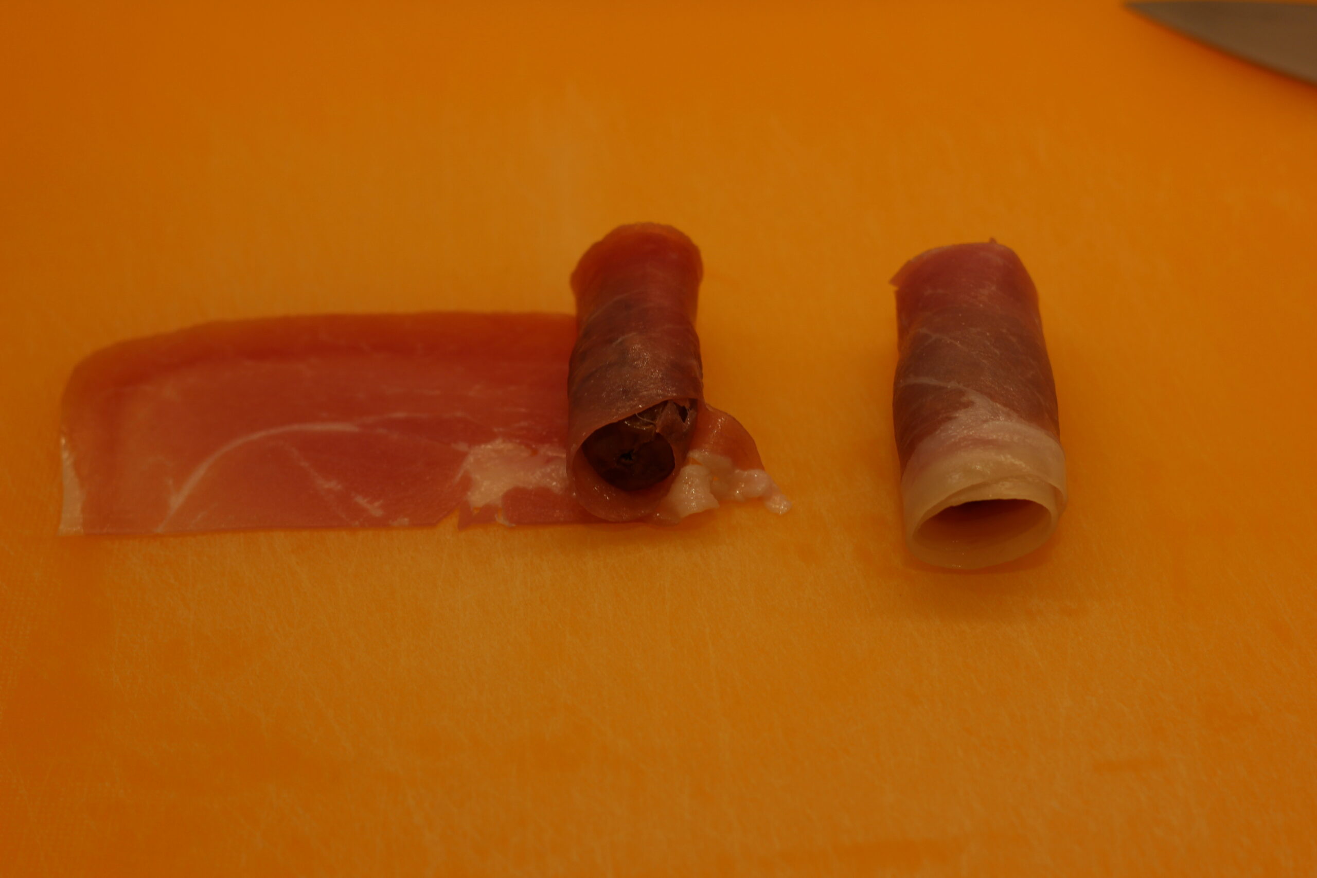 Die Speckscheiben der Länge nach halbieren.