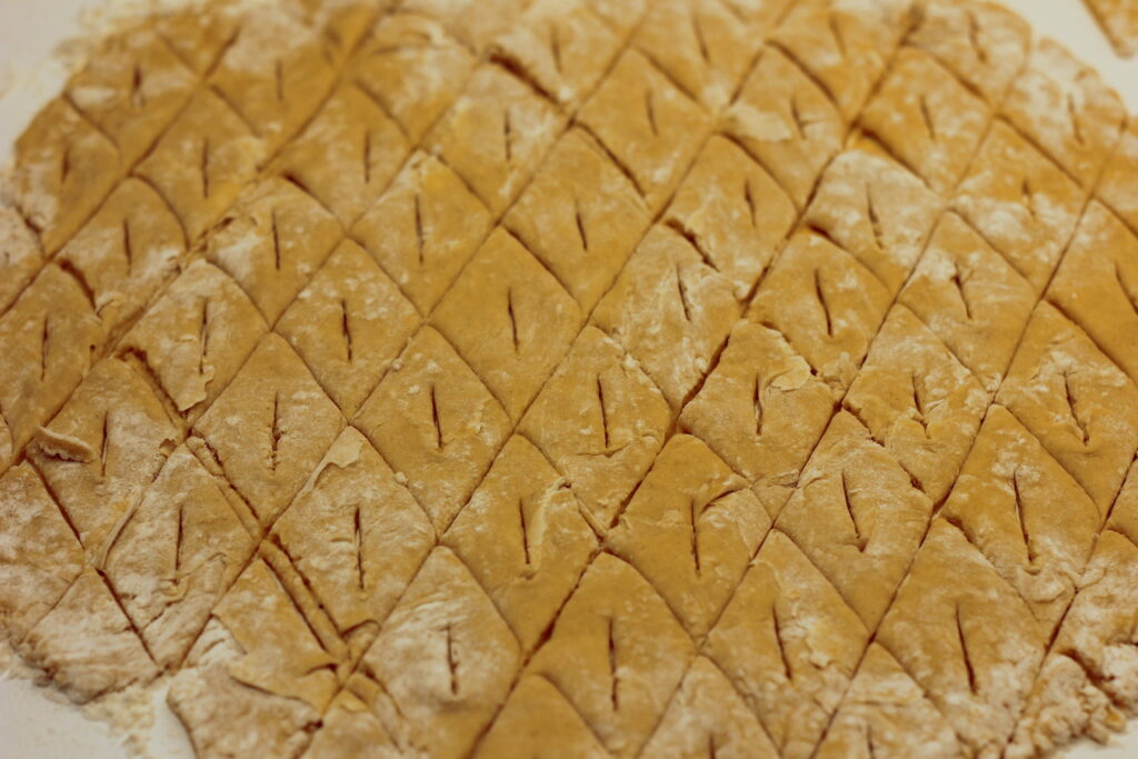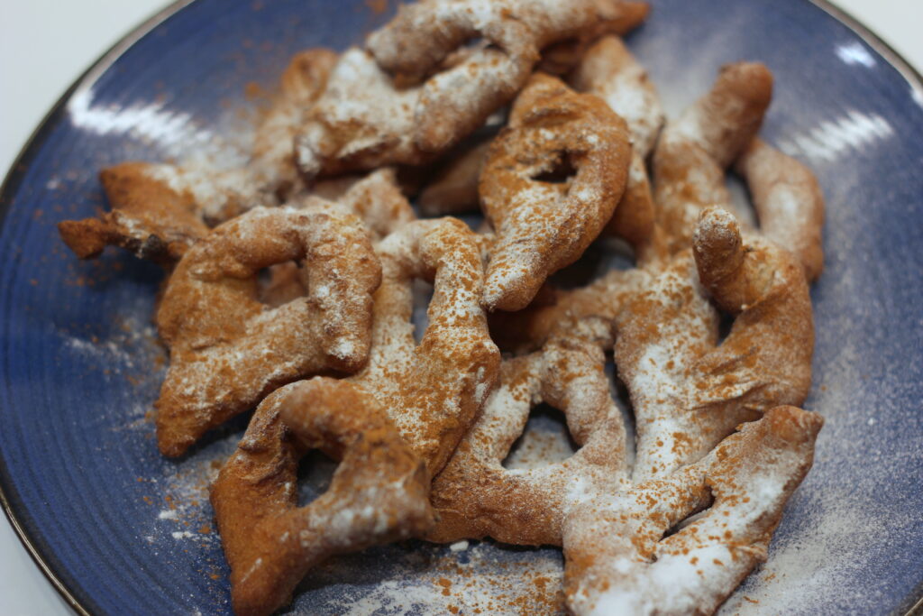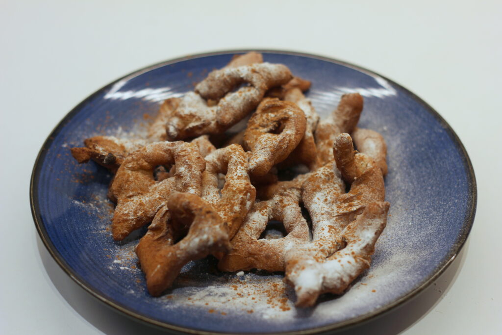 Das Frittierfett in einer Fritteuse* oder einem großen Topf* erhitzen. Währenddessen den Teig auf einer leicht bemehlten Fläche dünn ausrollen. Mit einem Teigroller* oder einem stumpfen Messer in Rauten schneiden und längs einen Schnitt in die Mitte machen. Ein Ende durch den Schlitz ziehen.