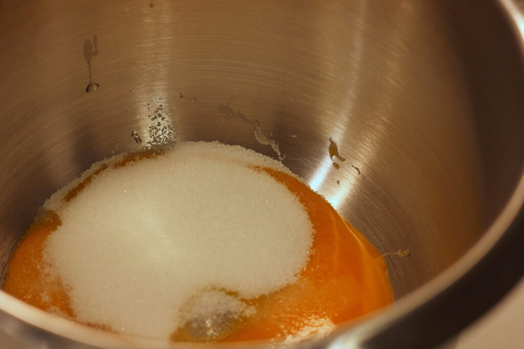 In der Küchenmaschine* oder mit dem Handrührgerät* Eigelb und Zucker schaumig rühren, dann den Alkohol einarbeiten.