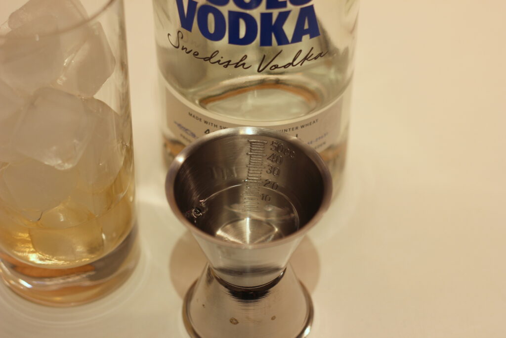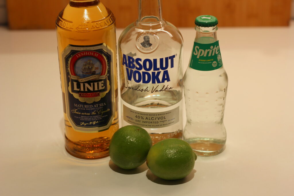 Ein Highball-Glas* mit Eiswürfeln füllen. Aquavit, Wodka und Limettensaft hinzugeben, mit der Limo auffüllen.