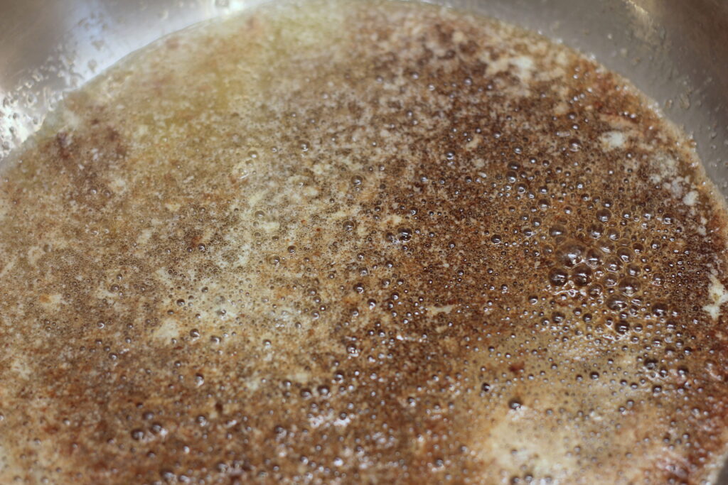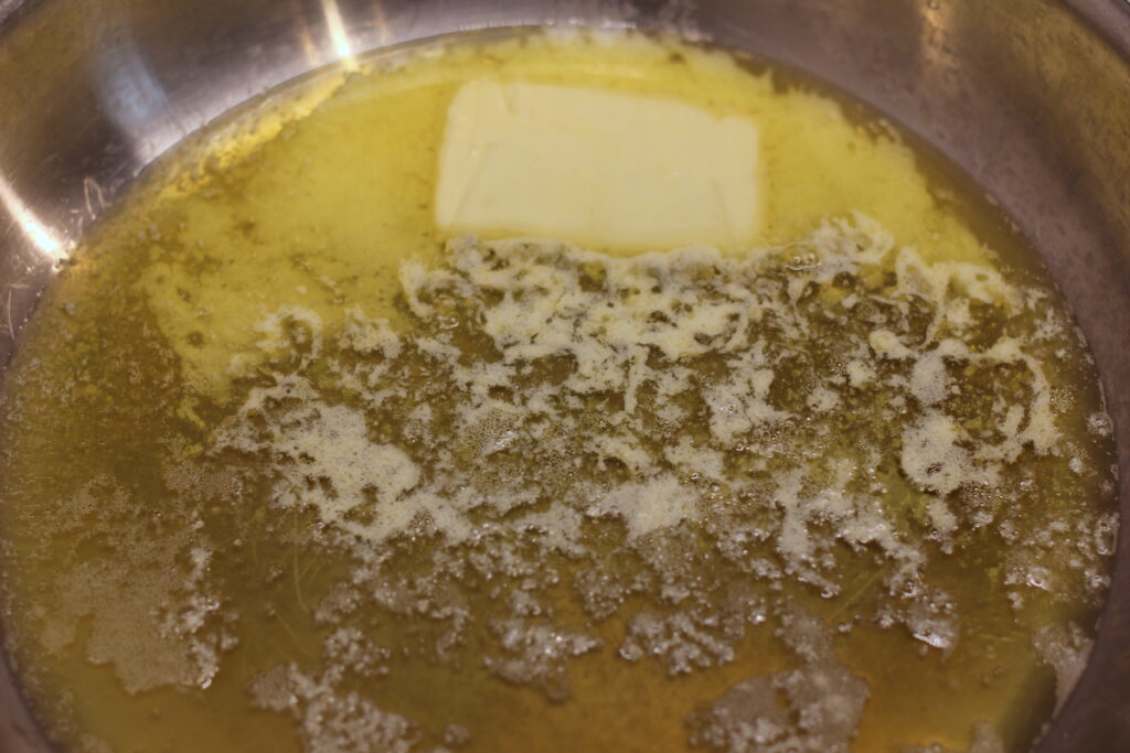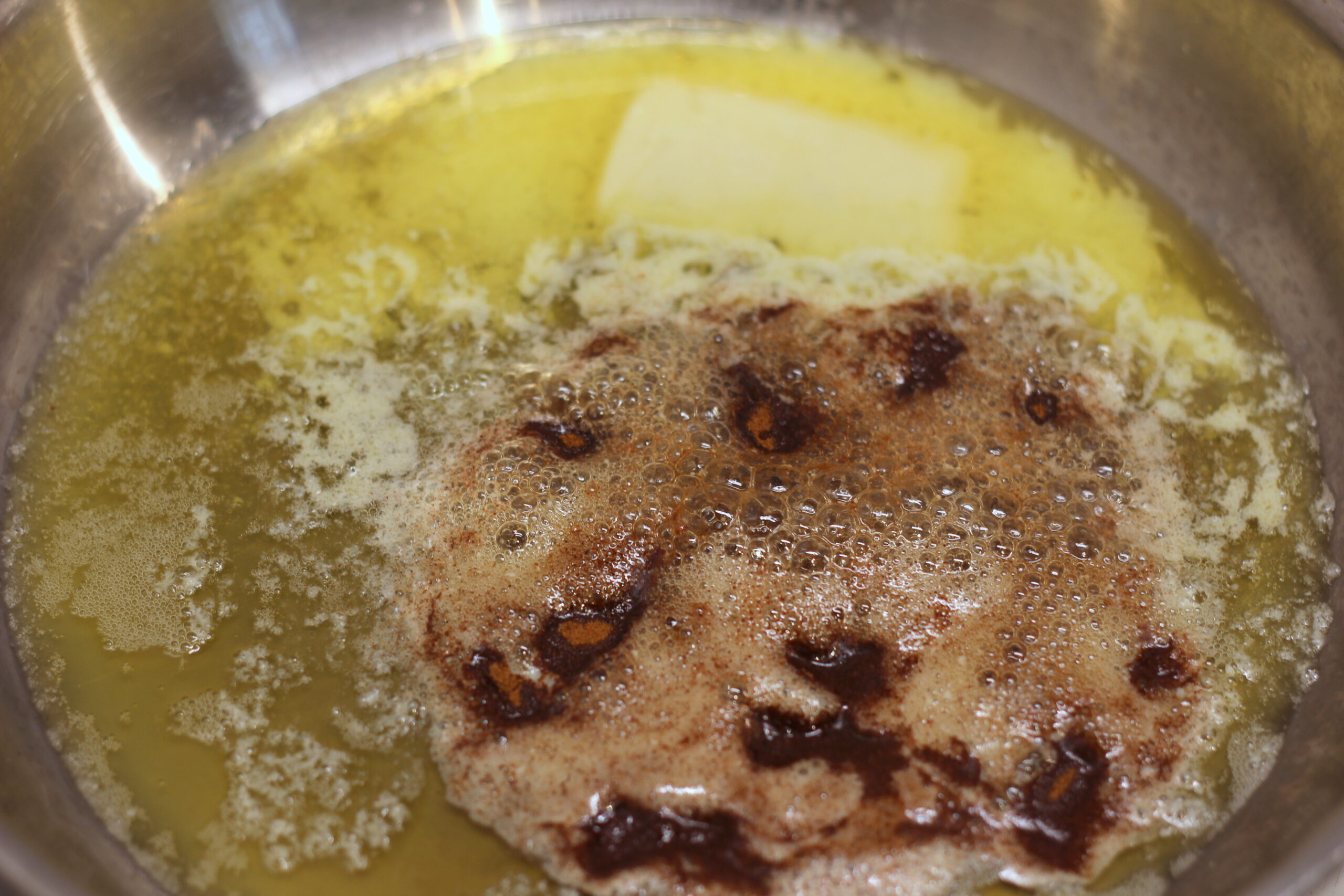 Parallel in einer Pfanne die Butter bei mittlerer Hitze schmelzen und den Zimt einrühren.