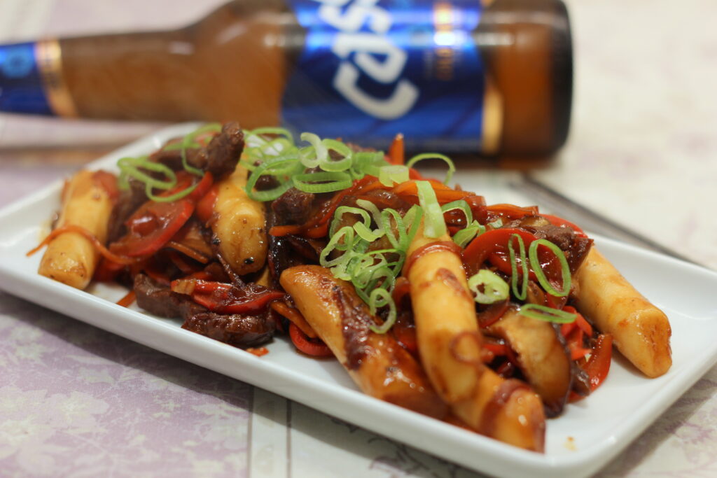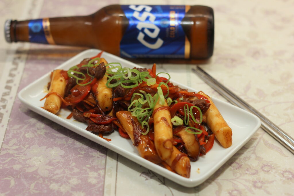 Gungjung Tteokbokki (궁중 떡볶이) setzt sich aus Gungjung (궁중, „Königshof“), Tteok (떡, „Reiskuchen“) und Bokki (볶이, „unter Rühren gebratenes und gewürztes Essen“) zusammen.