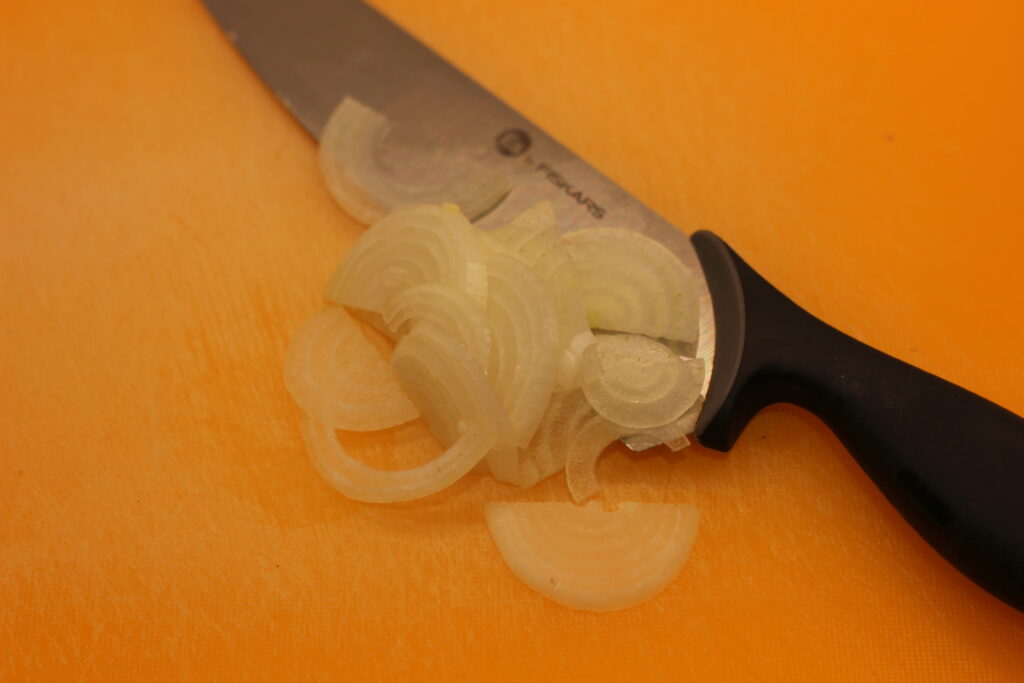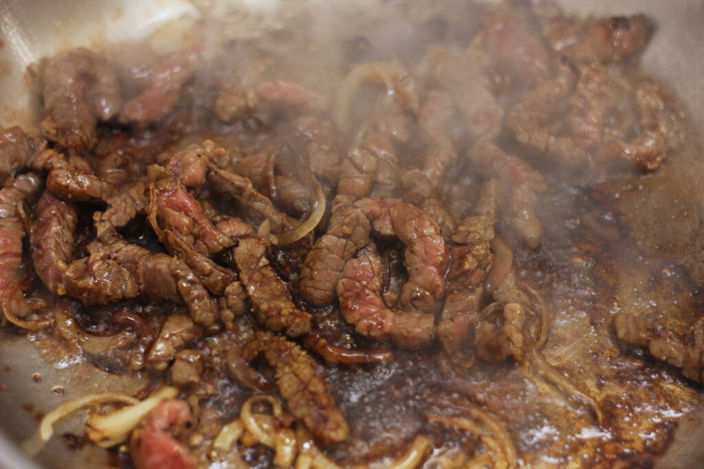 Eine Pfanne* bei mittlerer bis hoher Hitze erwärmen und etwas Öl hineingeben. Die Zwiebeln hinzufügen und unter Rühren glasig anschwitzen, dann das Fleisch hineingeben und etwa 1 Minute rundherum anbraten.