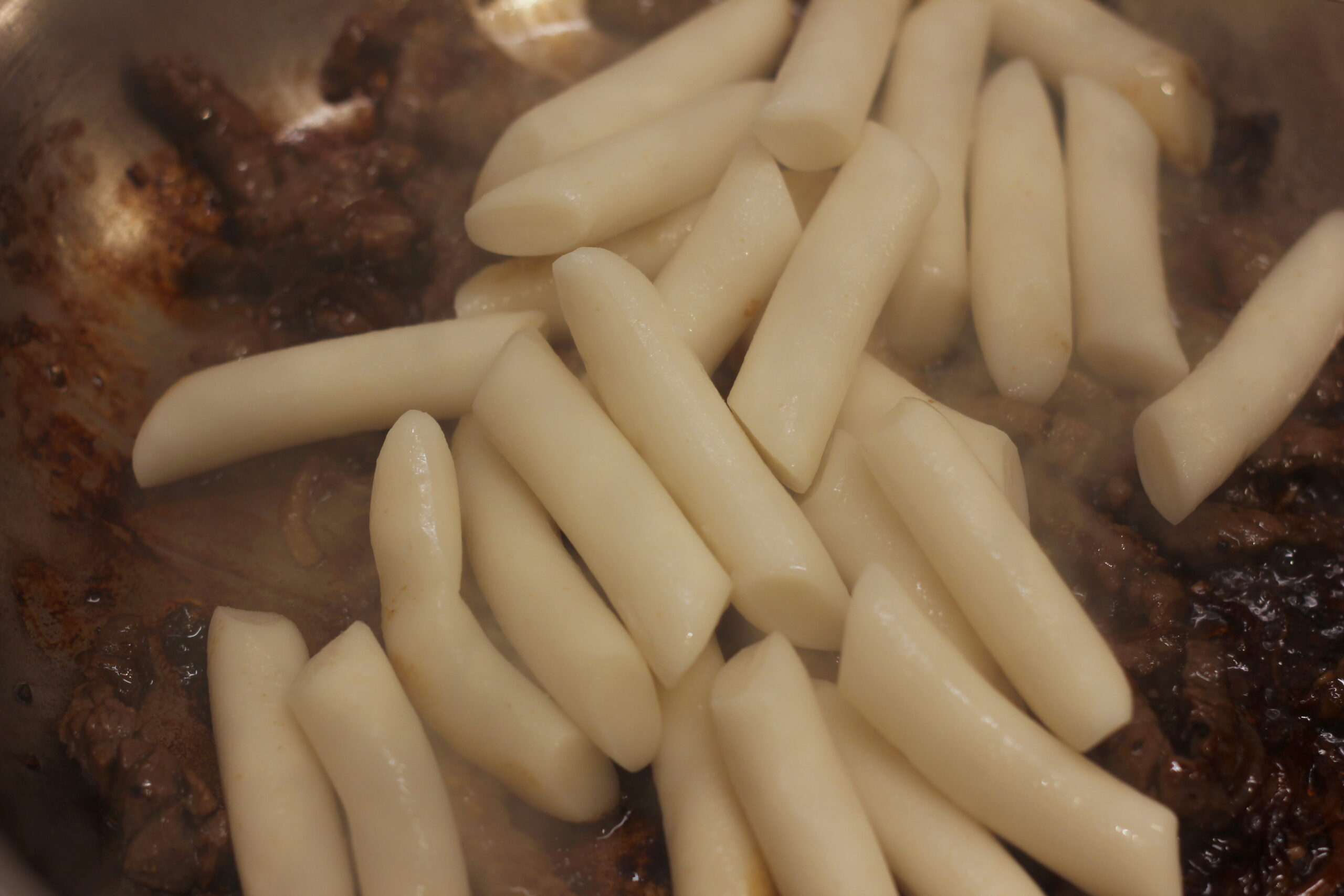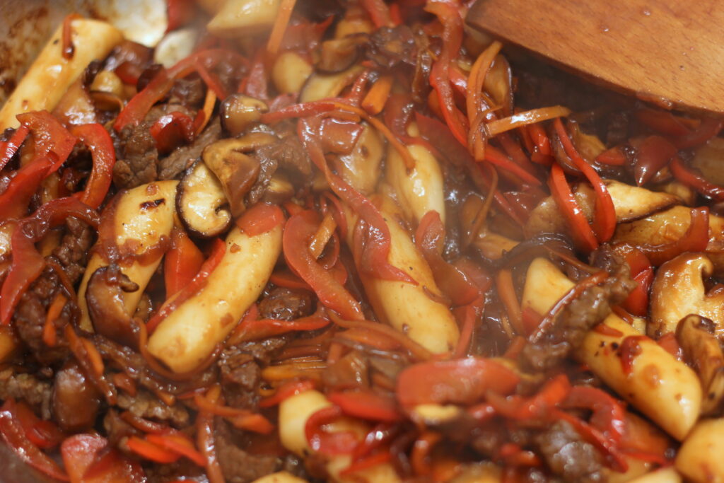 Die Temperatur hochdrehen und Garaetteok, Paprika, Pilze und Möhre sowie die Sauce hinzugeben und unter Rühren garen, bis das Gemüse weich ist.