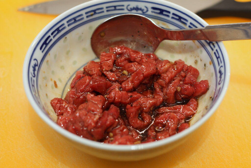 In einem zweiten Schüsselchen alle Zutaten für die Marinade gut verrühren, dann das Fleisch hineingeben und gut mischen.