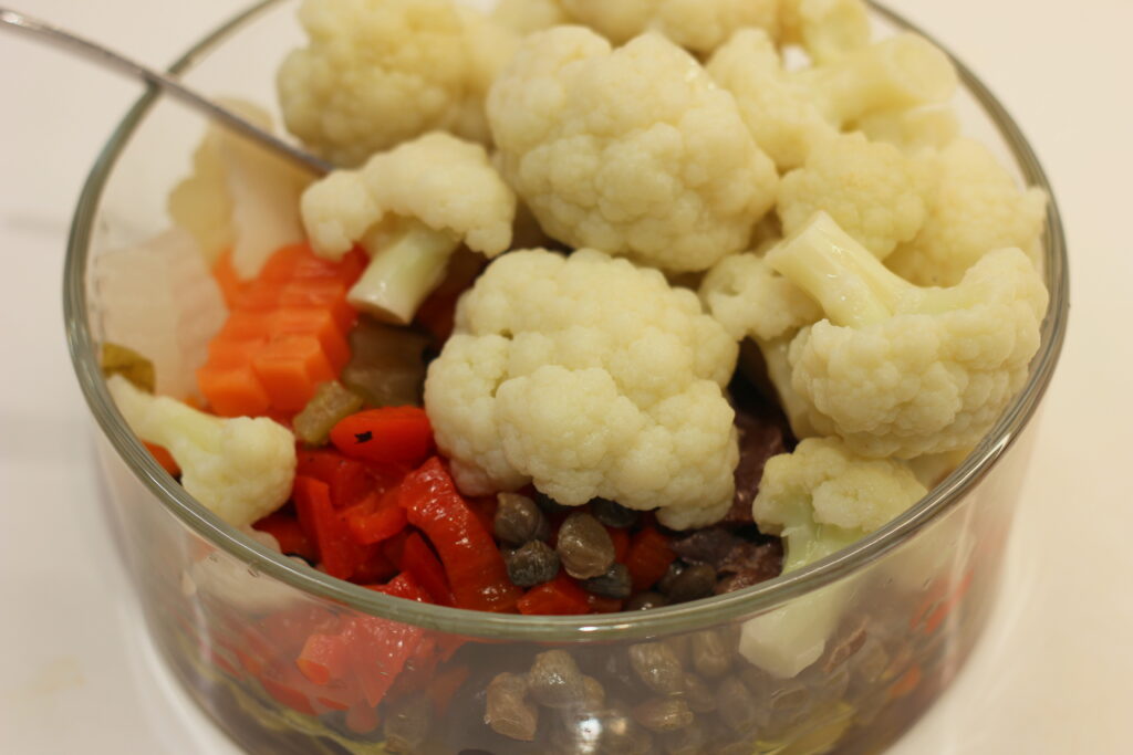 Über die Jahre kamen weitere Schichten neuer Zutaten hinzu, wie zum Beispiel Anchovis, Oliven, Kapern, eingelegtes Gemüse, gekochter Blumenkohl…