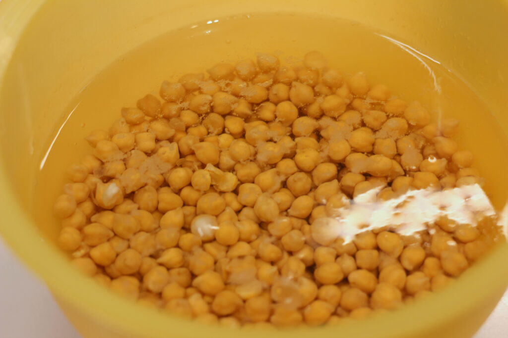 Die Kichererbsen mit einem TL Salz in dem dreifachen Volumen kalten Wasser über Nacht einweichen.