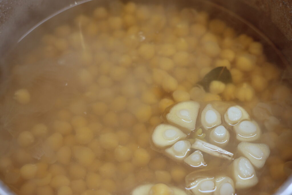 Das Einweichwasser wegkippen und die Kichererbsen in einem Topf* etwa 3 cm mit frischem Wasser bedecken. Einen weiteren TL Salz hinzugeben und aufkochen. 4 Minuten sprudelnd kochen lassen und den Schaum abschöpfen, dann die Temperatur herunterdrehen. Die Knoblauchknolle und das Lorbeerblatt hinzugeben und simmern lassen, bis die Kichererbsen weich sind.