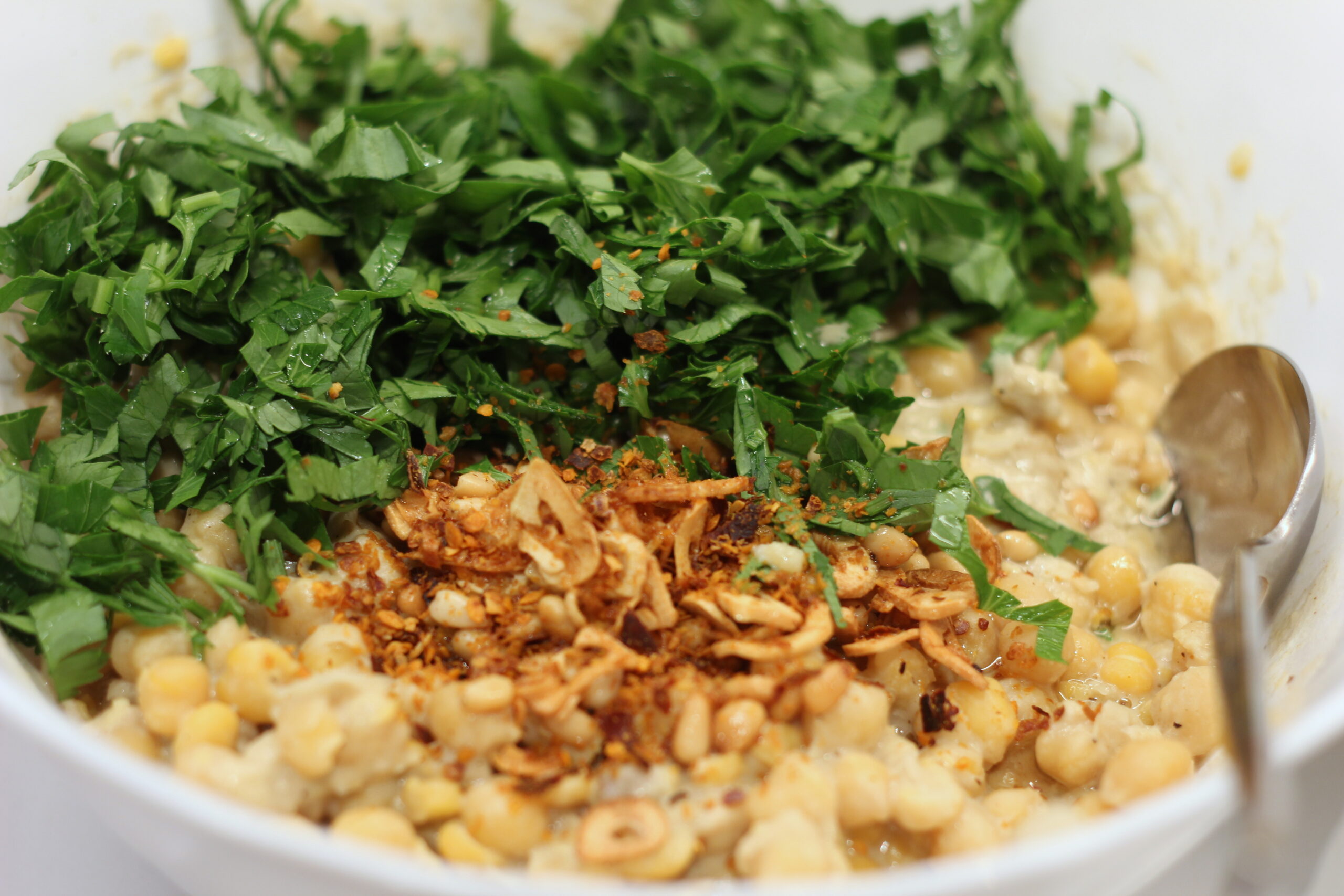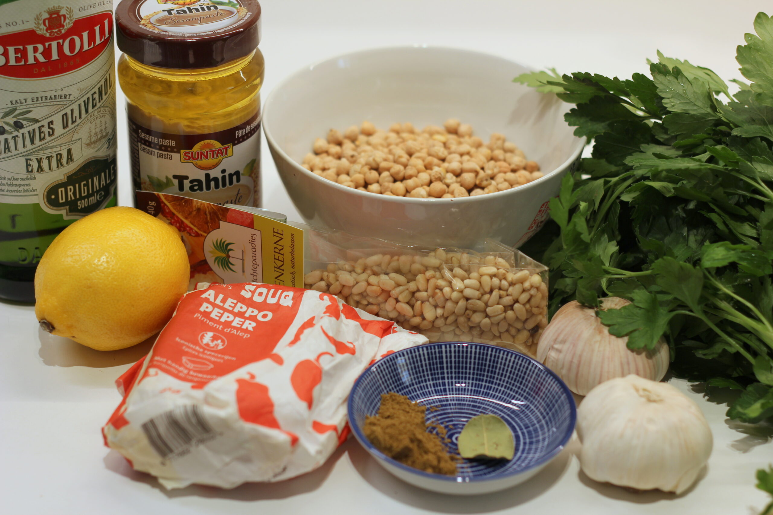Das Olivenöl in einer Pfanne* bei mittlerer Hitze erwärmen. Knoblauchscheiben und Pinienkerne darin unter ständigem Rühren goldgelb anrösten. Auf die Kichererbsen geben, darauf die Petersilie und den Aleppo-Pepper.