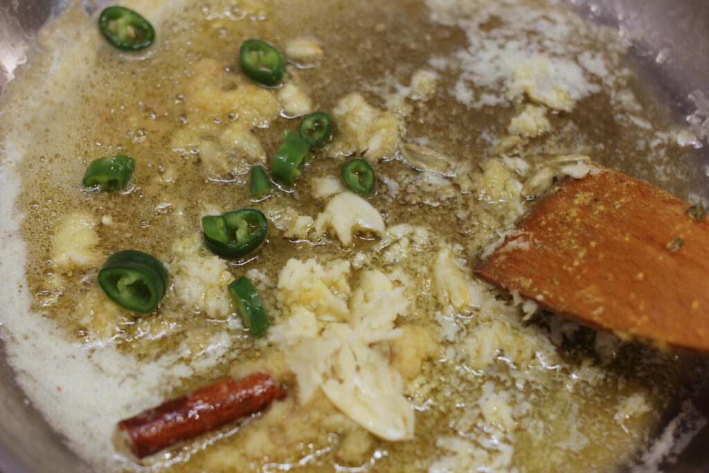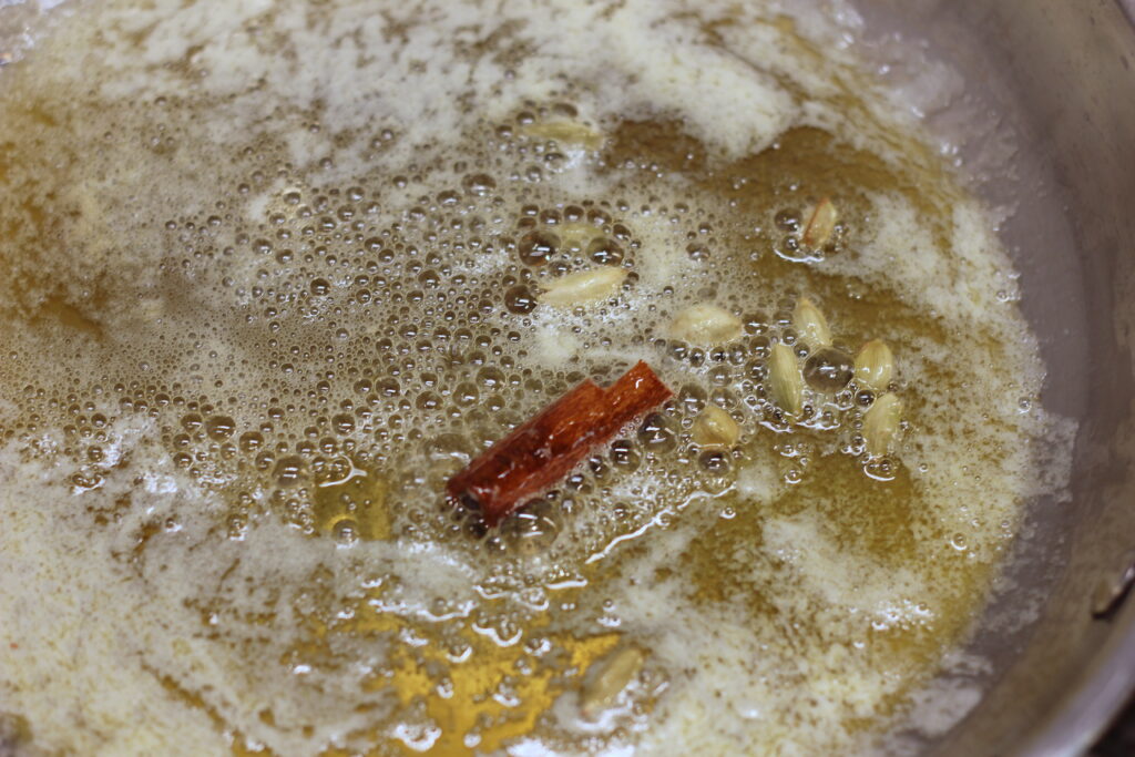 Die Butter bei mittlerer Hitze erwärmen. Kardamom und Zimt hineingeben und leicht anrösten, dann Ingwer, Knoblauch und Chilistücke dazugeben und ebenfalls anrösten. Die Bockshornklee-Samen hineingeben und unter Rühren etwa 5 Minuten braten.