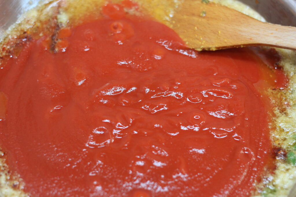 Tomaten in die Pfanne* geben, das Chili-Pulver und Salz. Bei mittlerer Hitze 15 bis 20 Minuten simmern lassen, bis sich ein dickes Püree gebildet und die Butter von der Sauce getrennt hat.