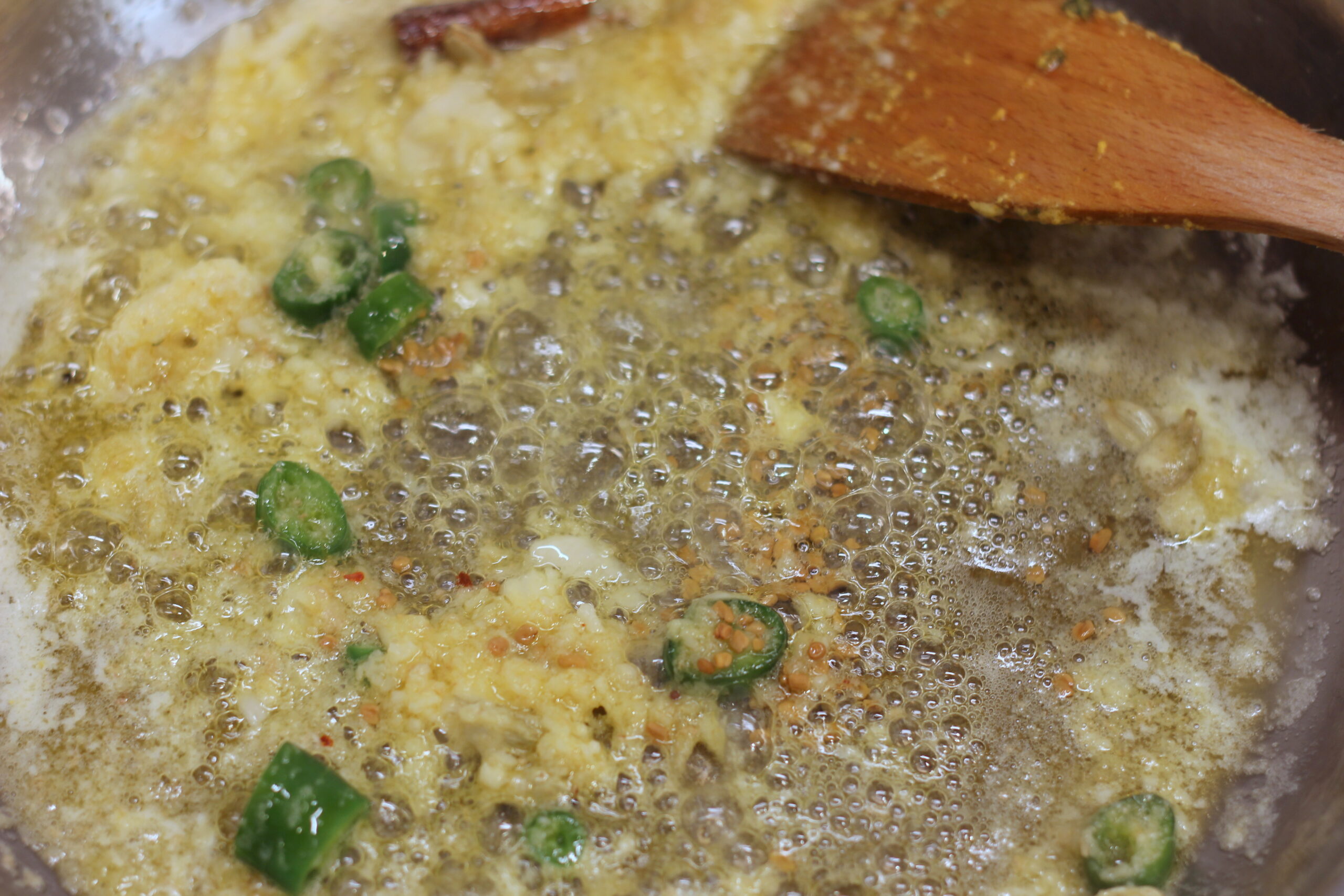 Die Butter bei mittlerer Hitze erwärmen. Kardamom und Zimt hineingeben und leicht anrösten, dann Ingwer, Knoblauch und Chilistücke dazugeben und ebenfalls anrösten. Die Bockshornklee-Samen hineingeben und unter Rühren etwa 5 Minuten braten.