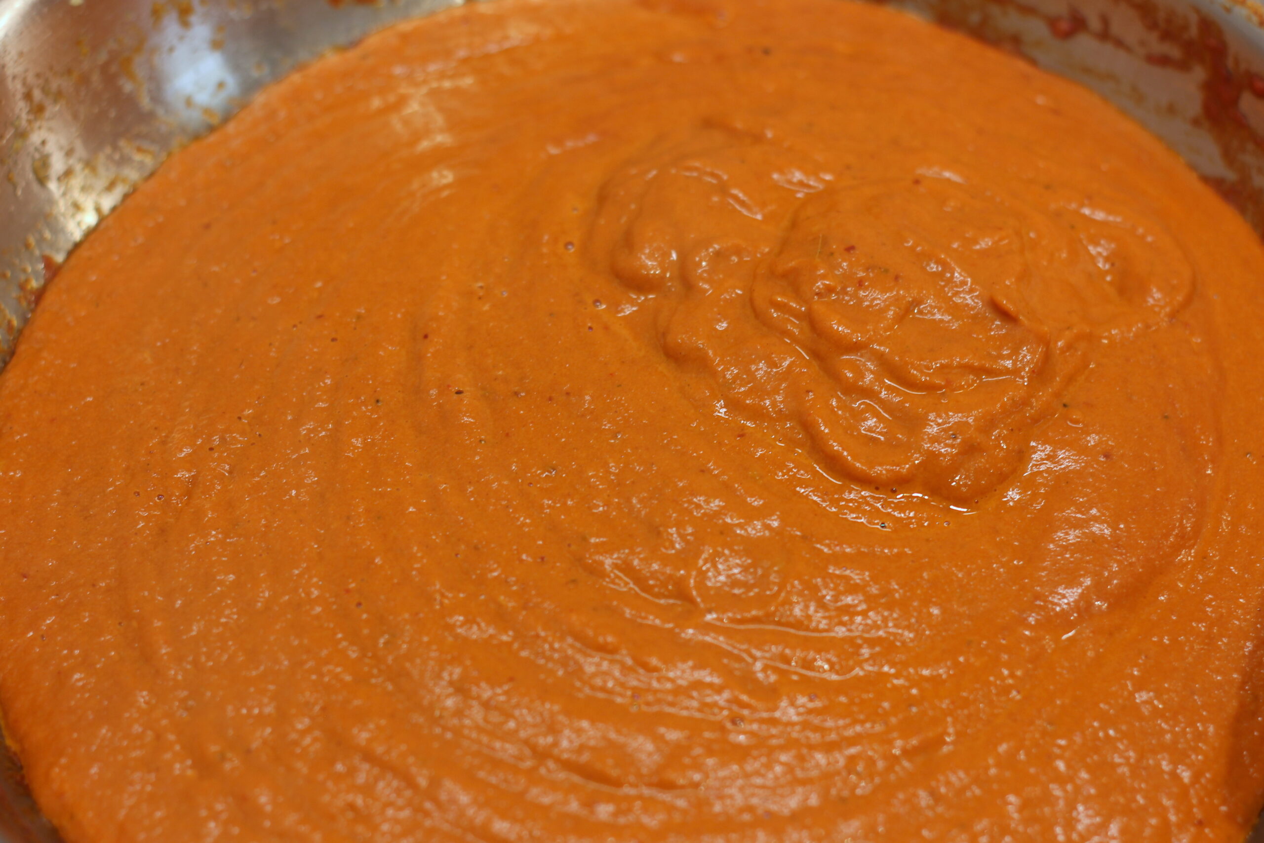 Tomaten in die Pfanne* geben, das Chili-Pulver und Salz. Bei mittlerer Hitze 15 bis 20 Minuten simmern lassen, bis sich ein dickes Püree gebildet und die Butter von der Sauce getrennt hat.