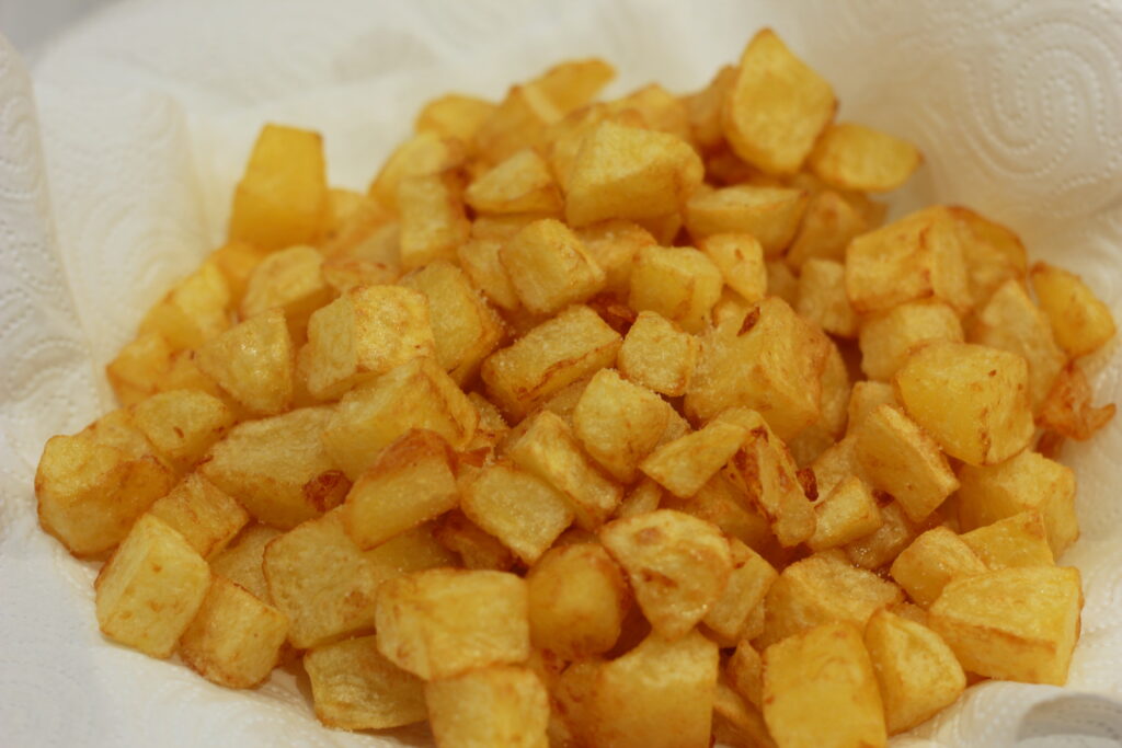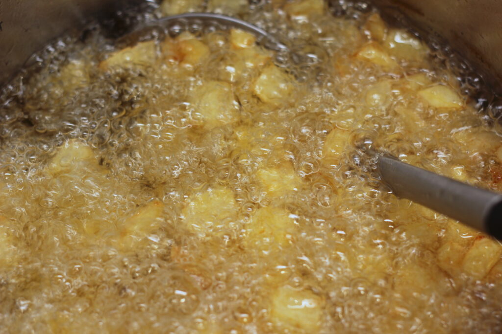 In einen großen Topf* das Frittieröl geben, die Kartoffelwürfel hineingeben und auf etwas mehr als mittlere Hitze erhitzen. Während man etwa alle 4 Minuten rührt die Kartoffeln goldbraun und knusprig frittieren.