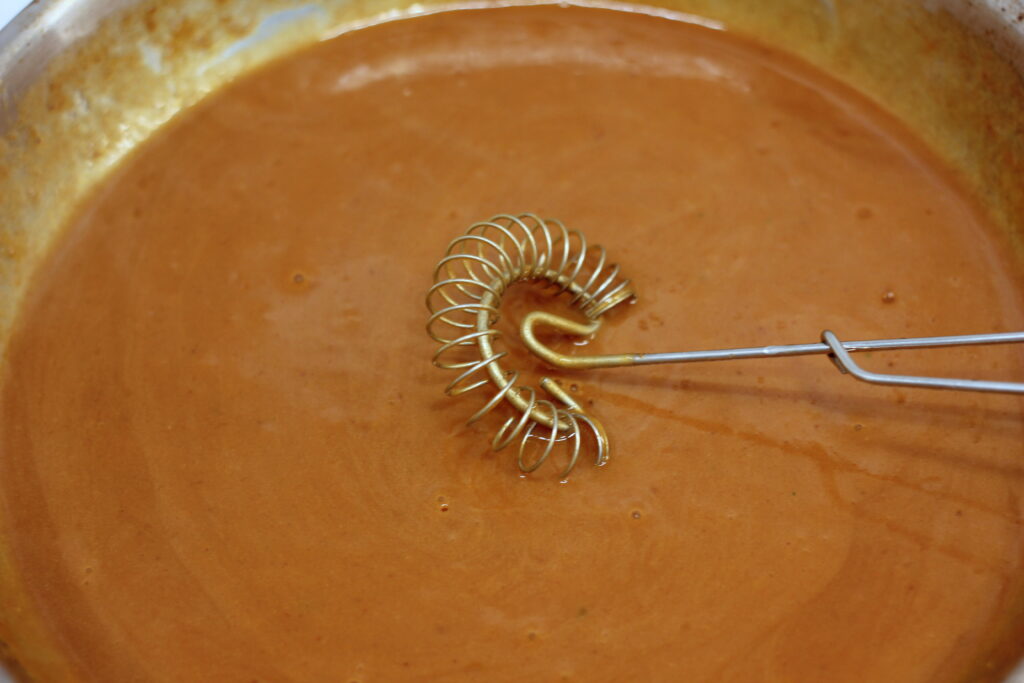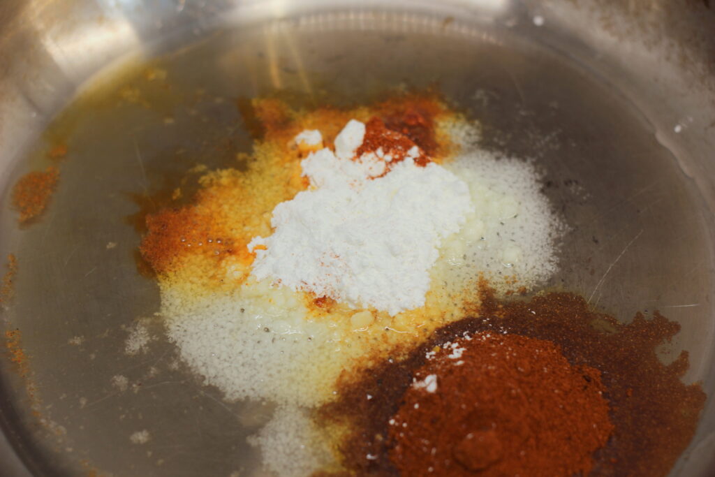 Währenddessen das Olivenöl in einer Pfanne* auf mittlere Temperatur erwärmen. Paprikapulver, Cayennepfeffer und Maisstärke einrühren, dann langsam die Brühe unterrühren. Zur gewünschten Konsistenz eindicken lassen, dann mit Essig und Salz abschmecken. Vom Herd nehmen.