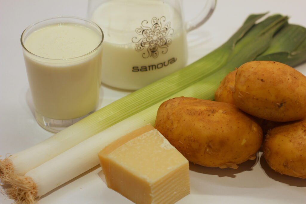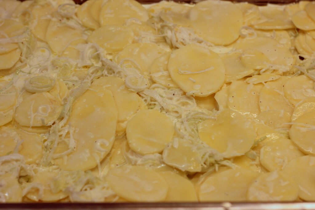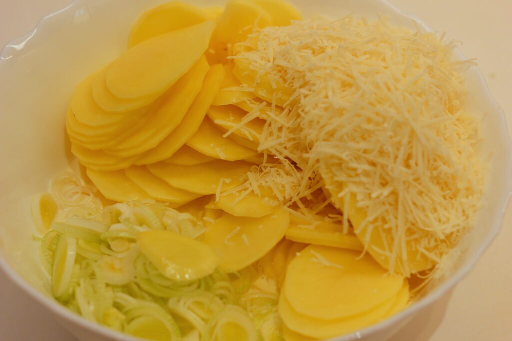 In einer Schüssel Kartoffeln, Lauch, Sahne und Parmesan mischen und mit Salz und Pfeffer würzen.