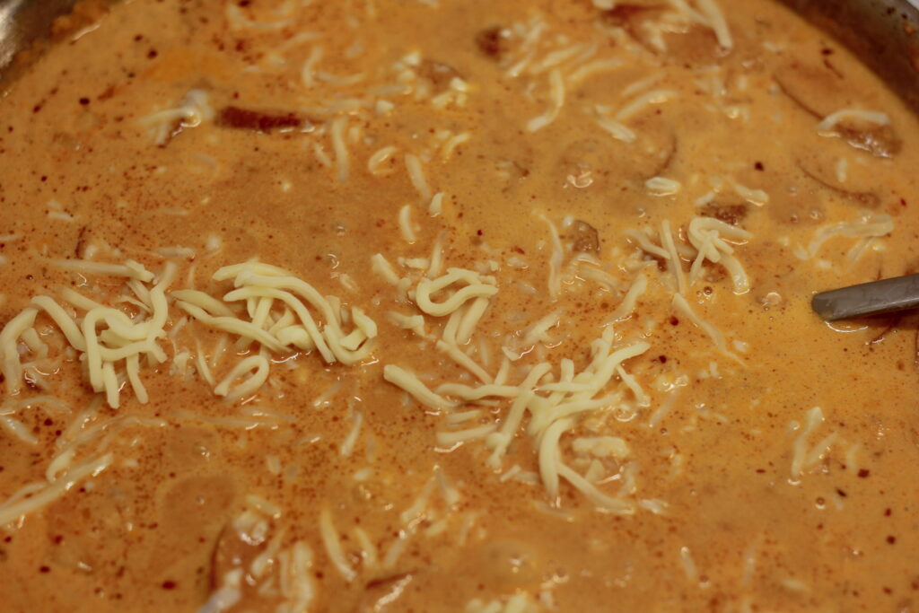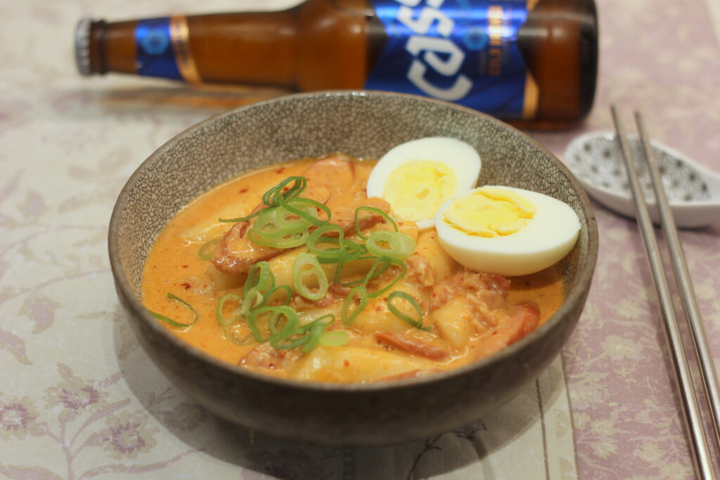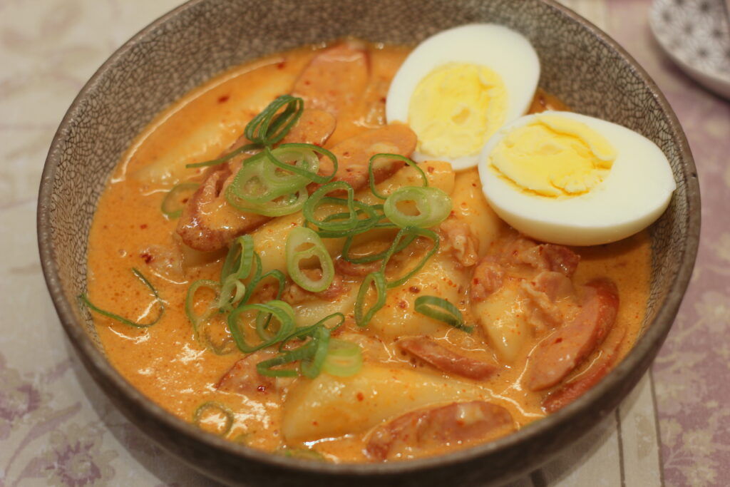 Rosé Tteokbokki hat durch die Kombination von Chili und Sahne ein etwas angenehmeres heat level.