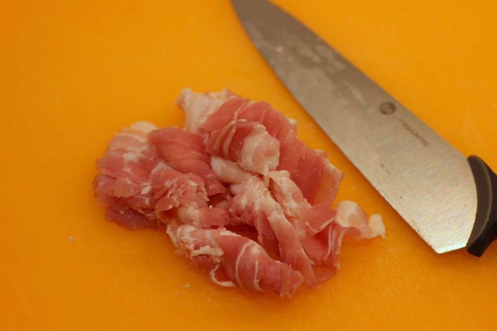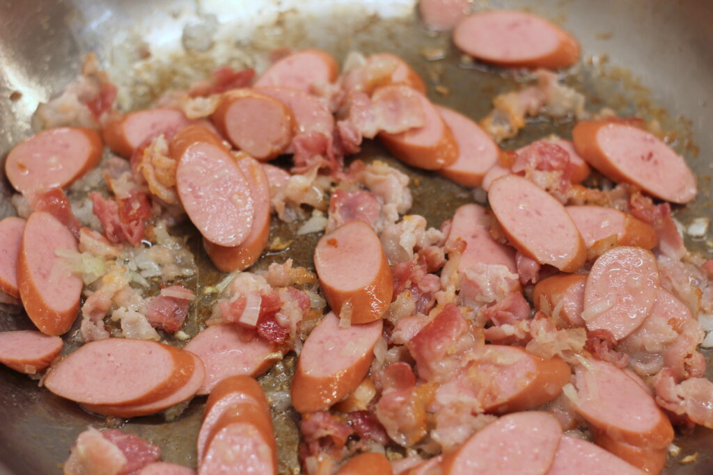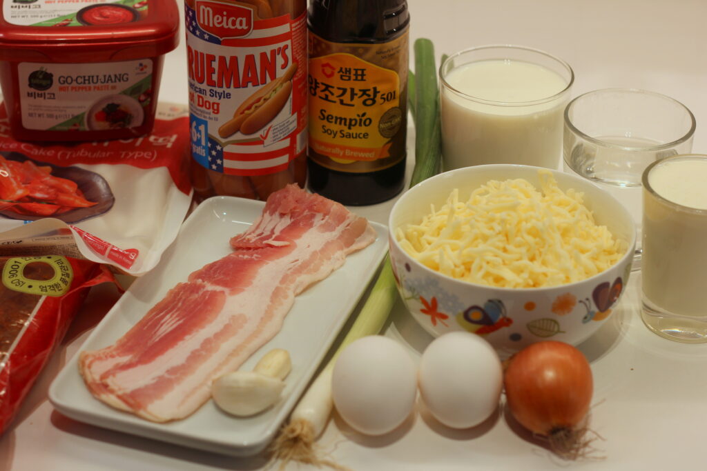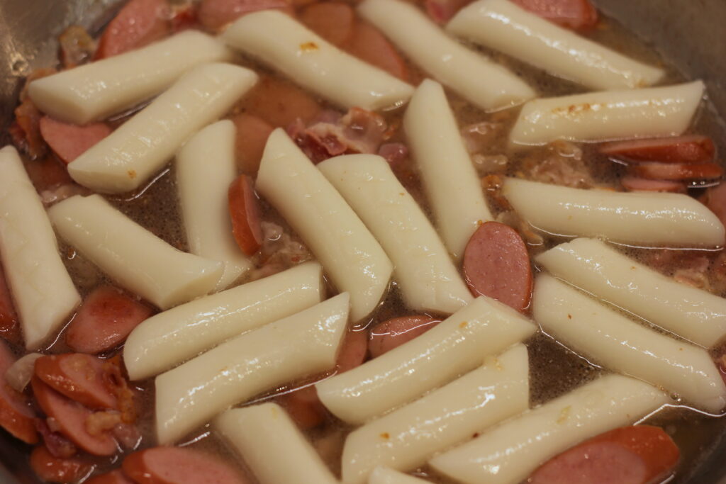 Den Bacon in eine Pfanne* geben und bei mittlerer Hitze erwärmen. Ist der Bacon nach Wunsch knusprig gegebenenfalls überschüssiges Fett bis auf einen kleinen Rest entfernen. Zwiebel und Knoblauch hinzugeben und glasig werden lassen, dann die Würstchen einrühren und leicht Farbe annehmen lassen. Nun Garaetteok und Wasser in die Pfanne rühren und mit aufgelegtem Deckel simmern lassen, bis die Garaetteok weich werden.