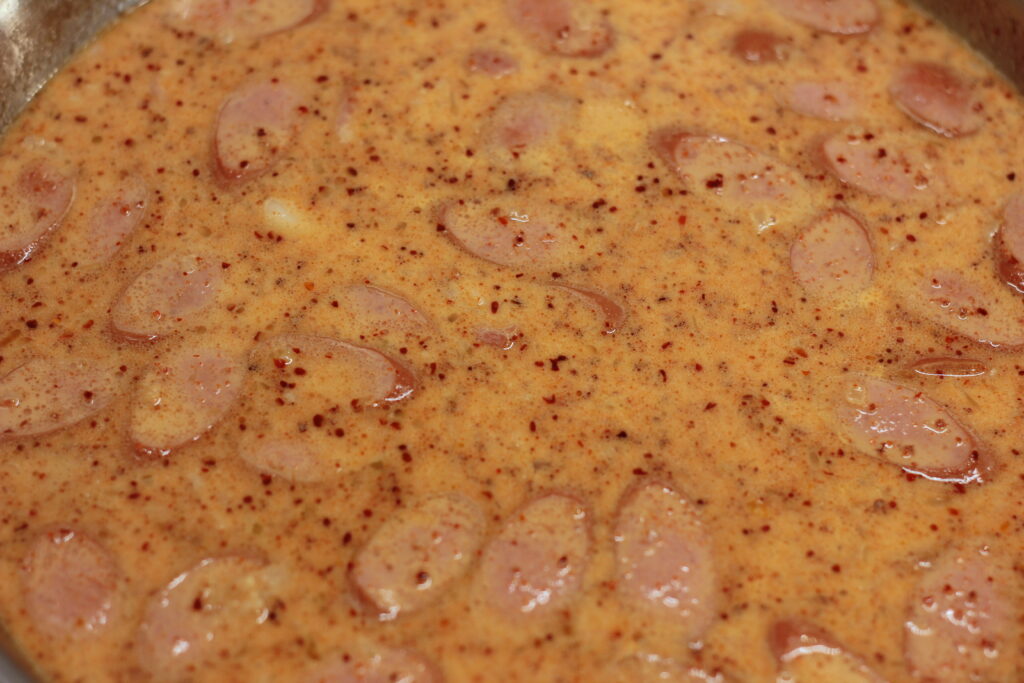 Sauce einrühren und weiter 5 Minuten simmern lassen, dabei gelegentlich rühren.