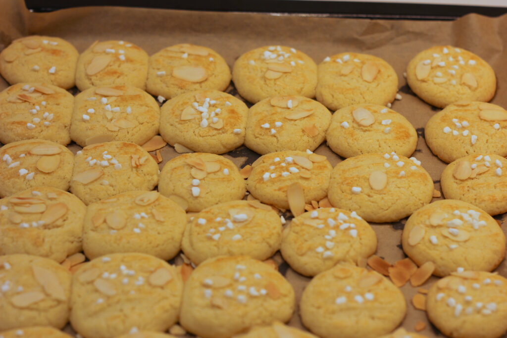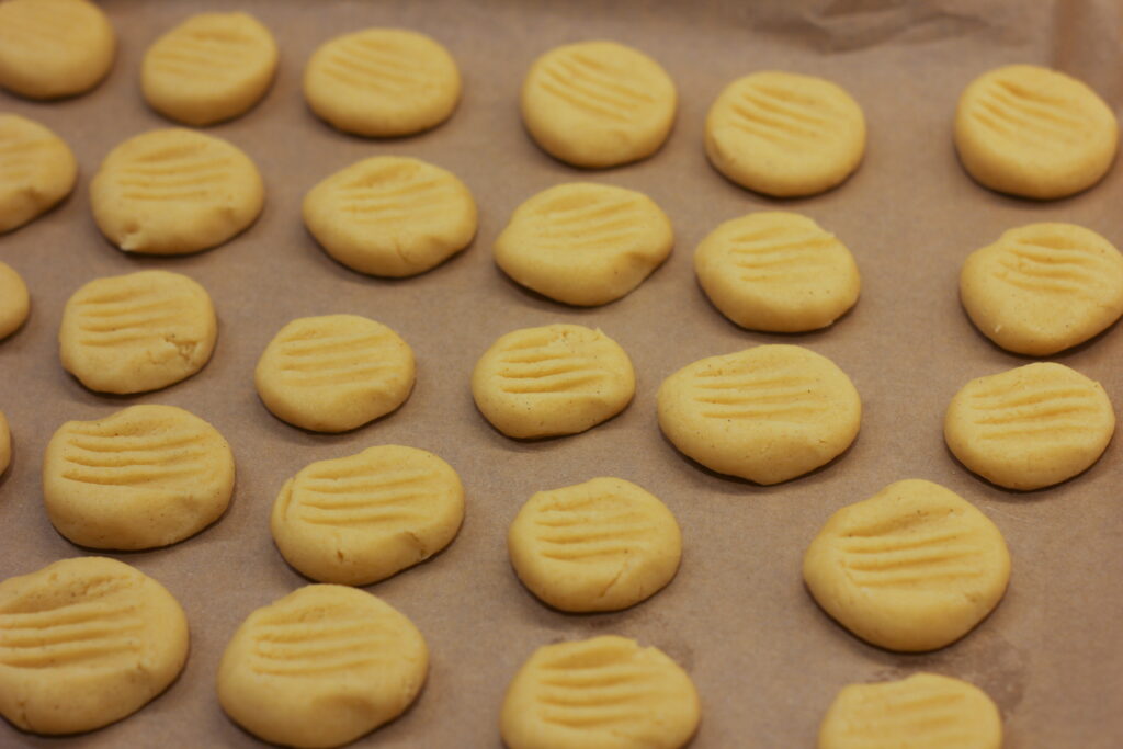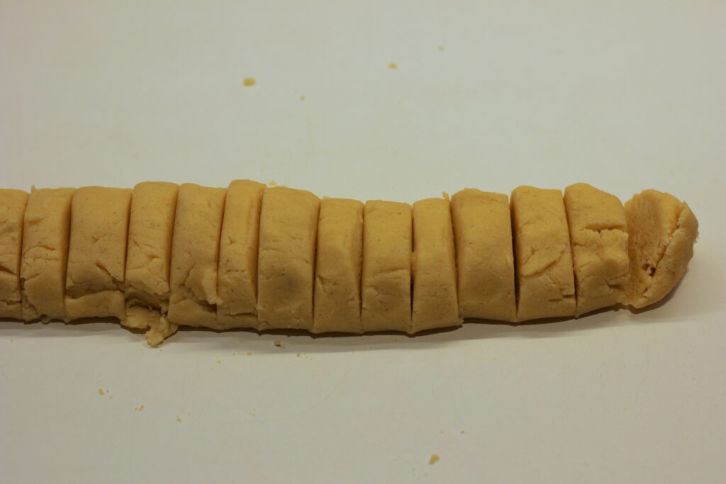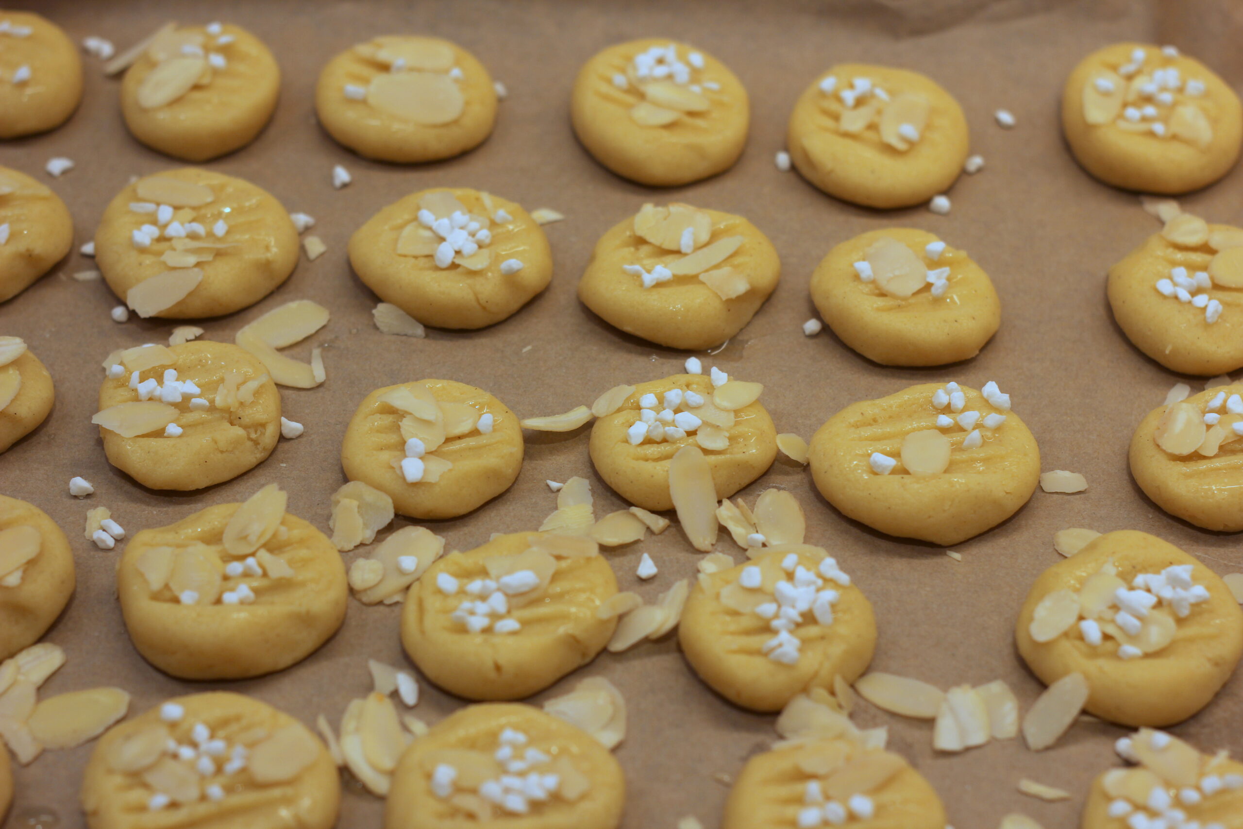 Zu einer Rolle formen und in etwa 30 gleichgroße Stücke schneiden. Jedes Stück zu einer Kugel rollen, dann etwas plattdrücken und mit einer Gabel Rillen in die Oberfläche pressen. Mit etwas Abstand auf ein mit Backpapier belegtes Backblech setzen. Mit Eiweiß bestreichen und mit Perlzucker und/oder Mandelplättchen bestreuen.