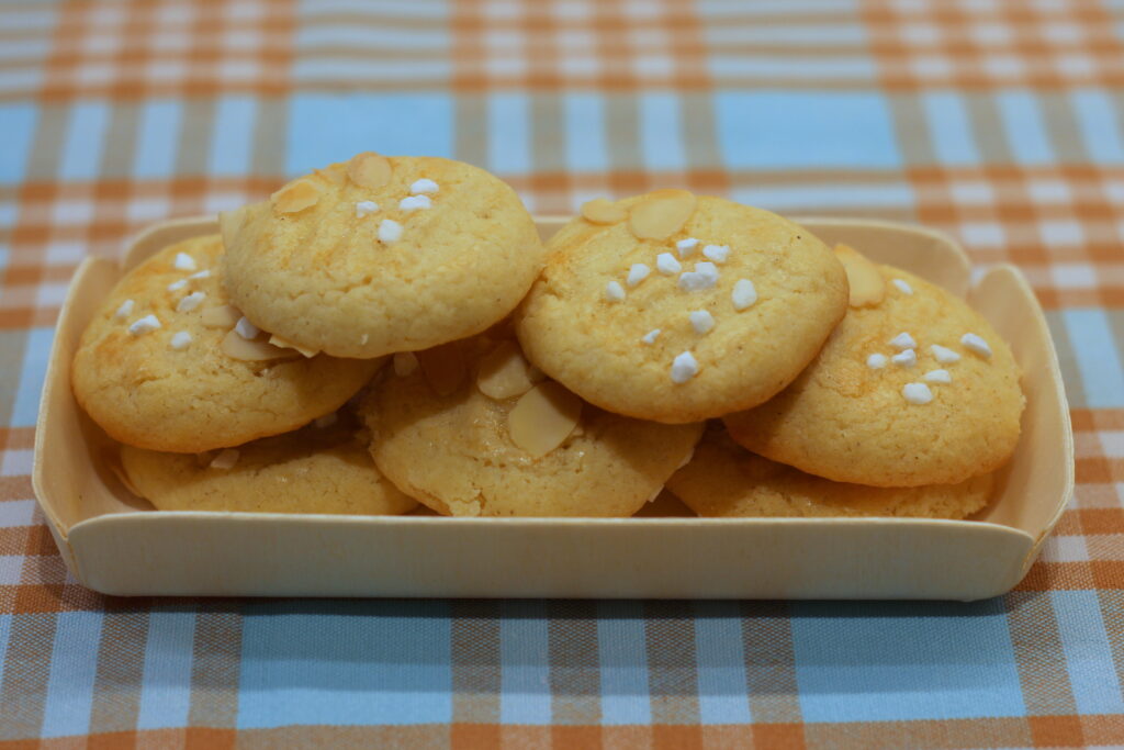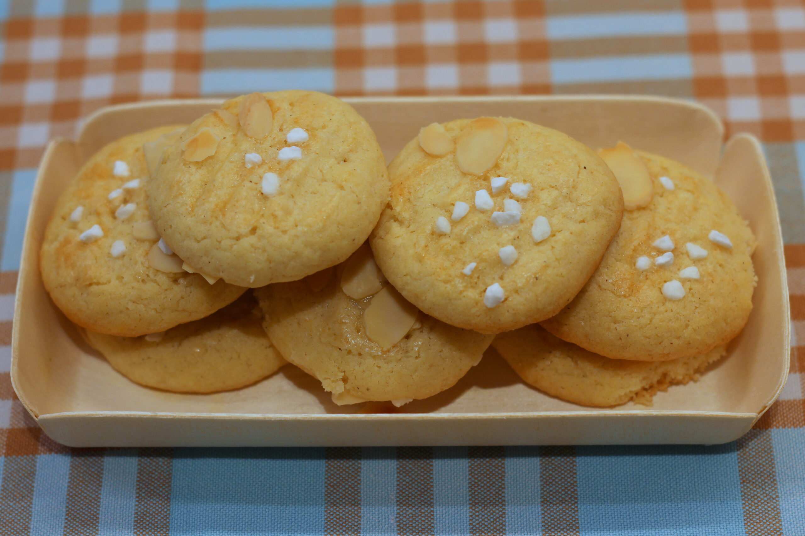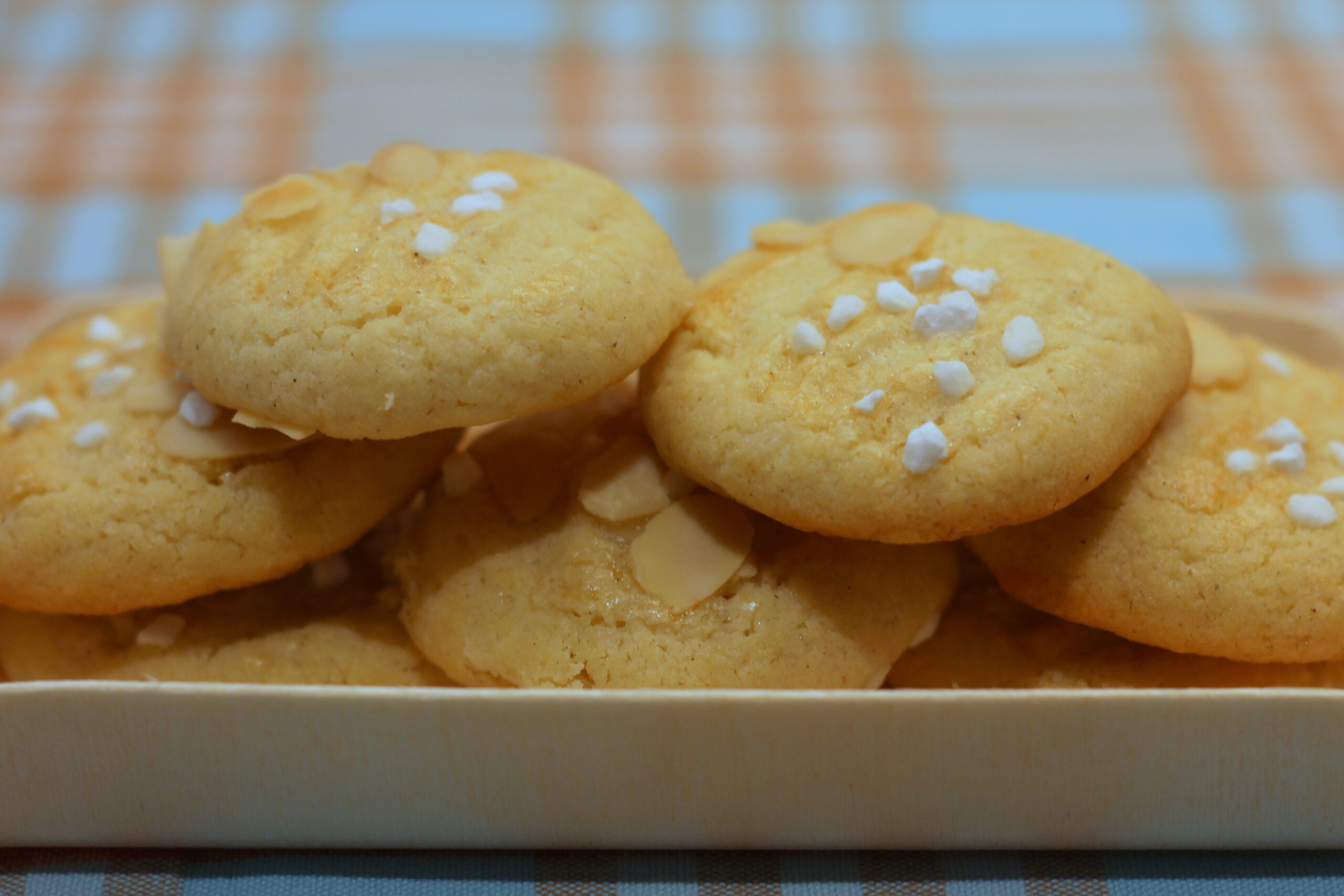 Zu einer Rolle formen und in etwa 30 gleichgroße Stücke schneiden. Jedes Stück zu einer Kugel rollen, dann etwas plattdrücken und mit einer Gabel Rillen in die Oberfläche pressen. Mit etwas Abstand auf ein mit Backpapier belegtes Backblech setzen. Mit Eiweiß bestreichen und mit Perlzucker und/oder Mandelplättchen bestreuen.