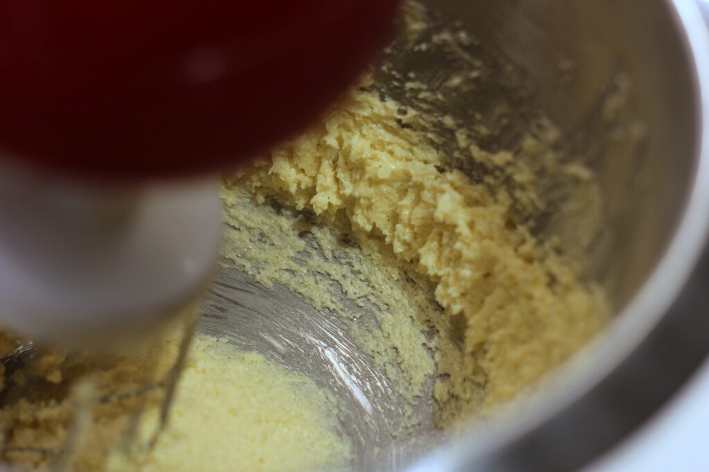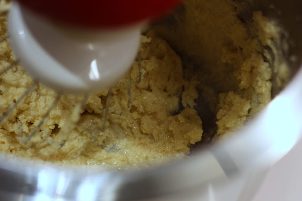 In der Küchenmaschine* die Butter cremig schlagen, dann den Zucker und den Vanillezucker einrieseln lassen und ebenfalls cremig rühren.