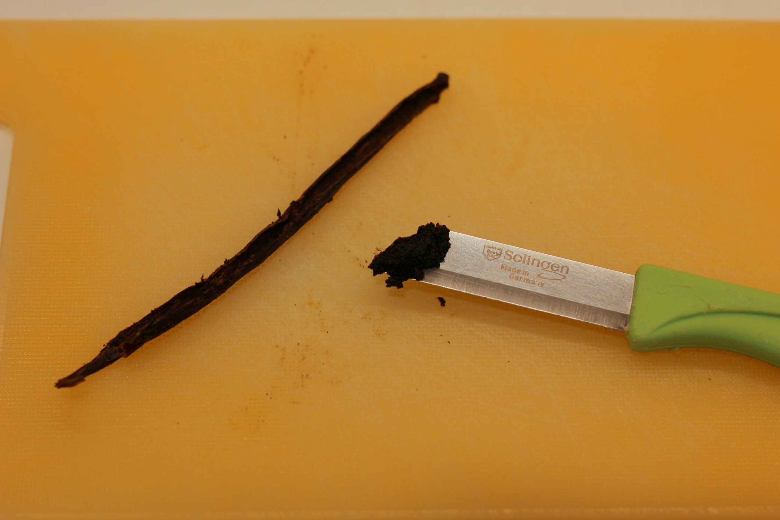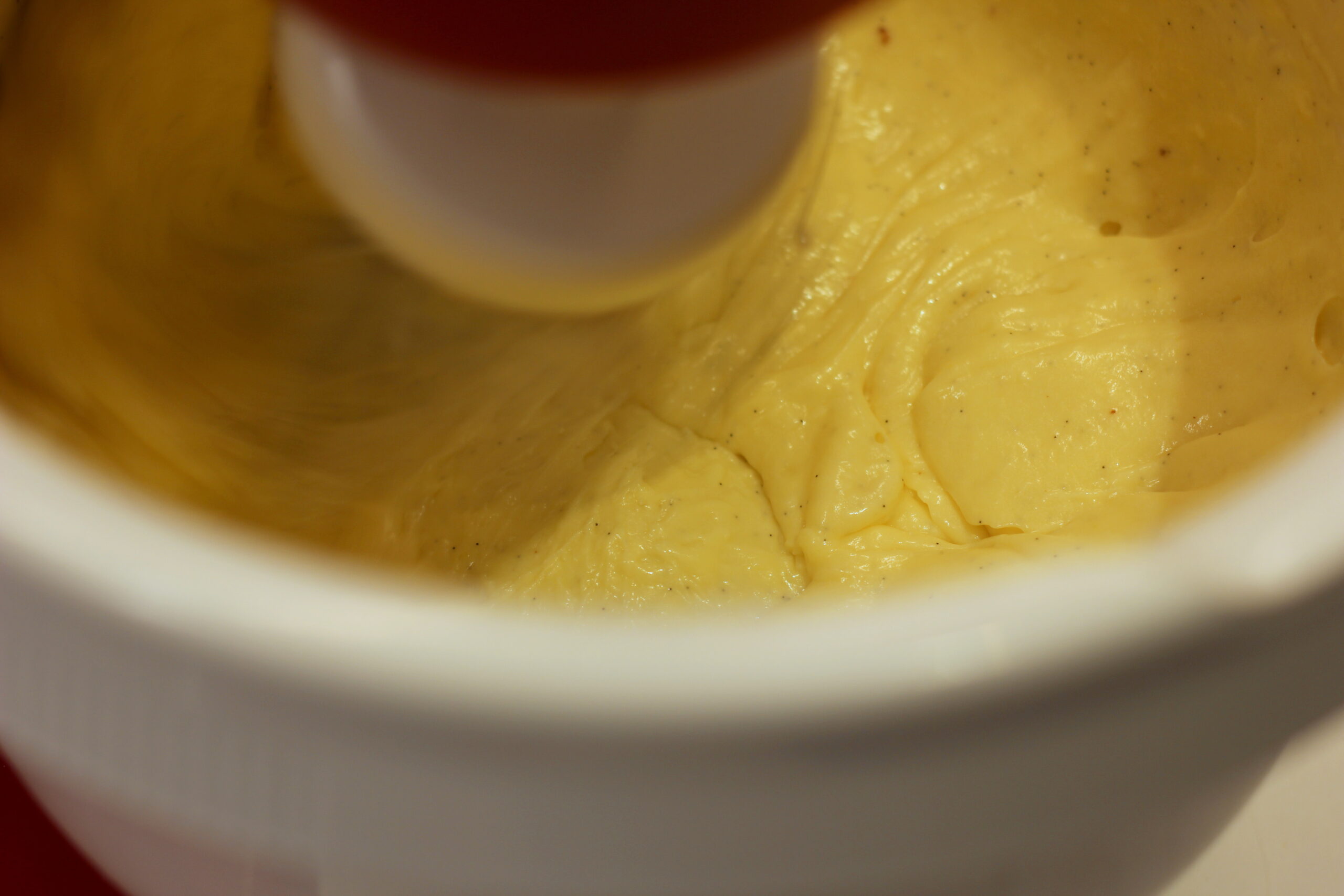 In einer Schüssel über einem Topf* kochenden Wassers Eigelb, Sahne, Zucker und Vanillemark unter ständigem Rühren erhitzen, bis die Creme eindickt. Komplett abkühlen lassen.