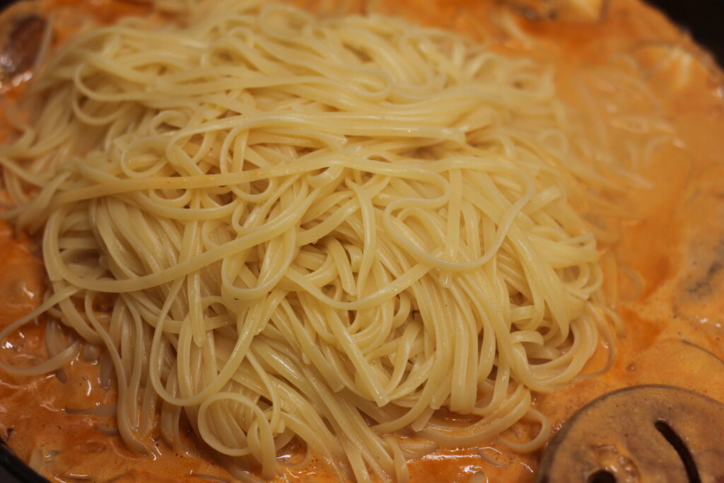 Die Nudeln untermischen und nach Bedarf mit Kochwasser der Nudeln verdünnen.