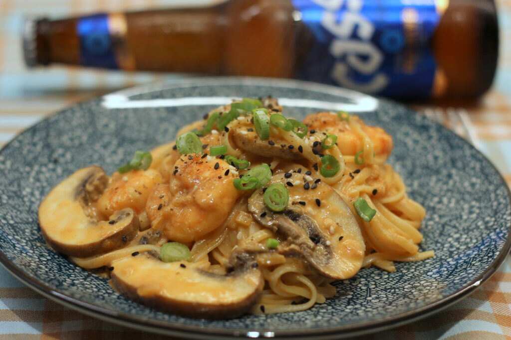 in der selben Pfanne die Butter schmelzen und Zwiebeln und Knoblauch glasig dünsten. Sahne, Milch, Gochujang, Tomatenmark, Sojasauce, Weißwein und Zucker einrühren. Etwa 7 Minuten köcheln lassen, dann die Garnelen wieder hinzugeben und den Parmesan unterrühren. Mit Salz und Pfeffer abschmecken.