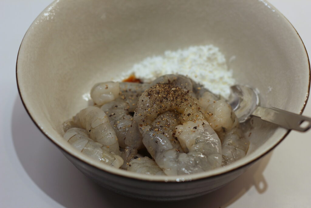 In einer Schüssel Garnelen mit Sojasauce, Sesamöl, Speisestärke und Pfeffer mischen und 10 Minuten ziehen lassen.