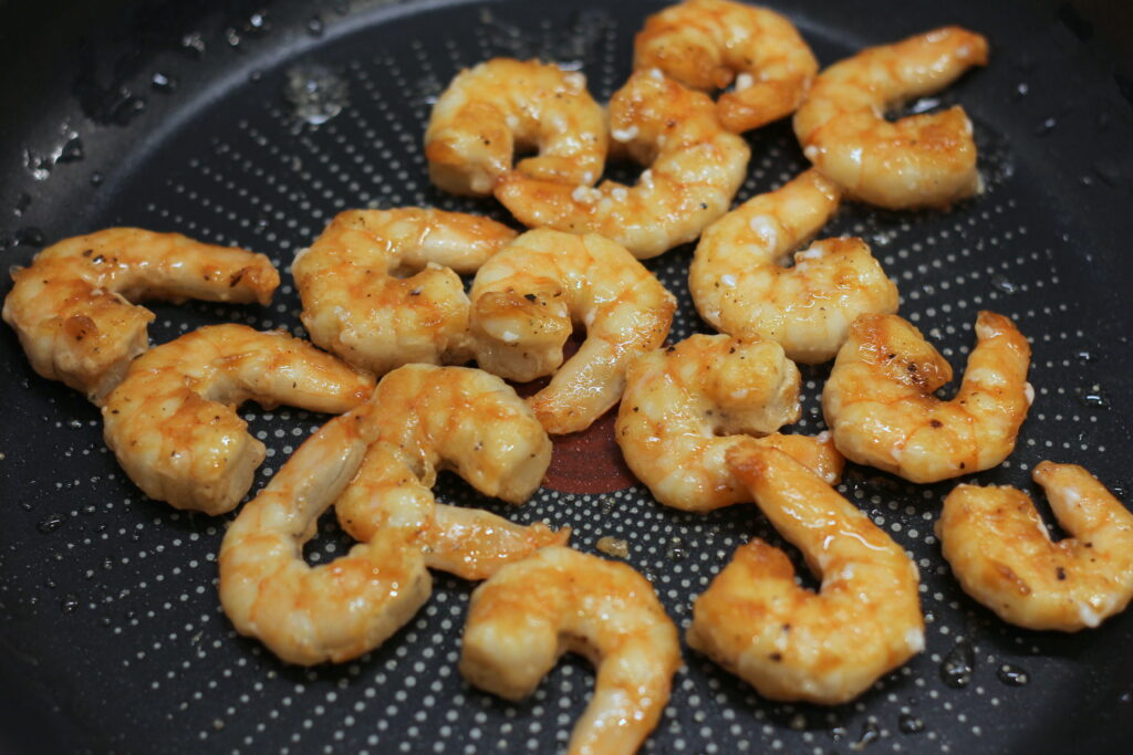 Parallel die Garnelen in einer Pfanne* von beiden Seiten 1 bis 2 Minuten in wenig Öl anbraten. Herausheben und zur Seite stellen.
