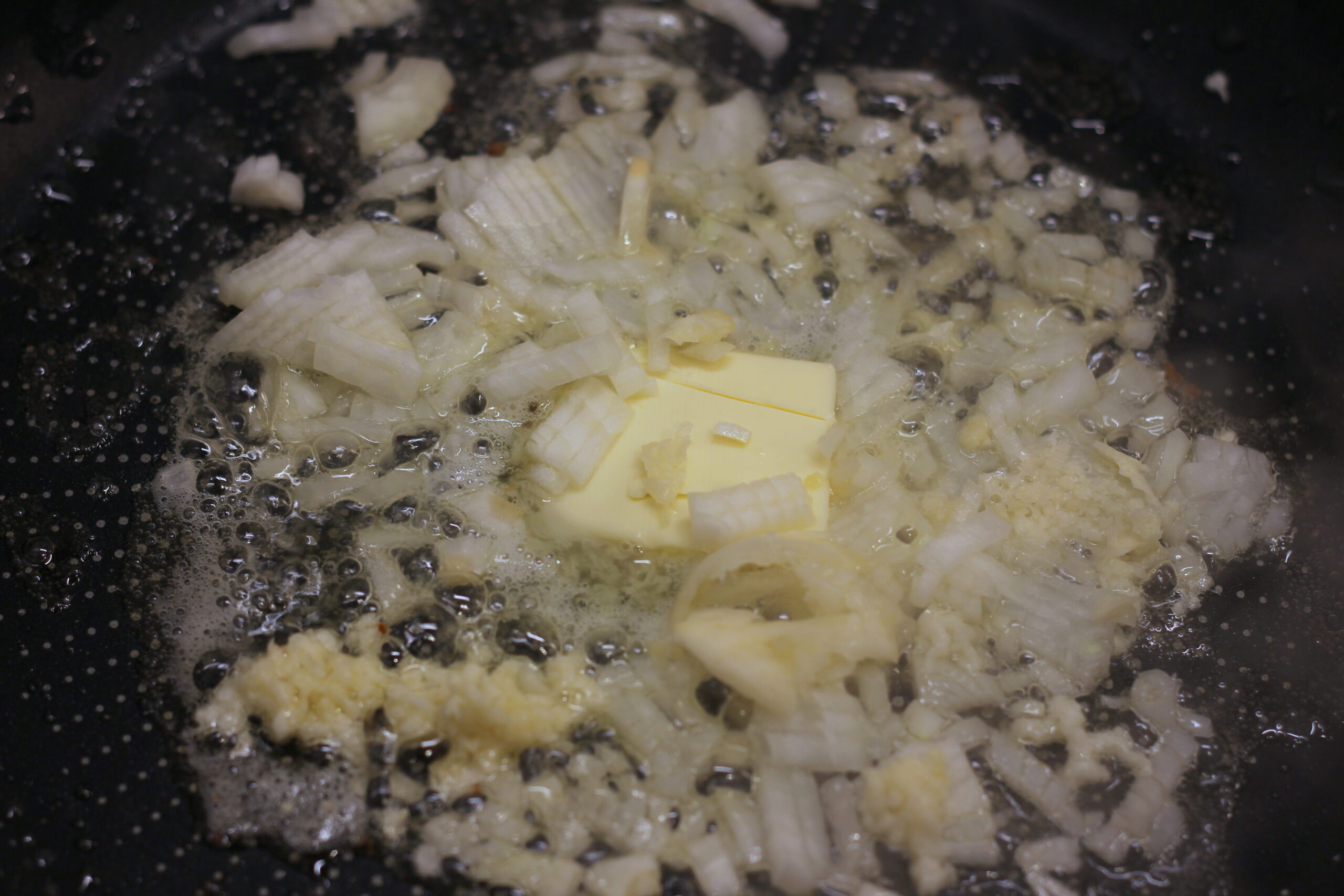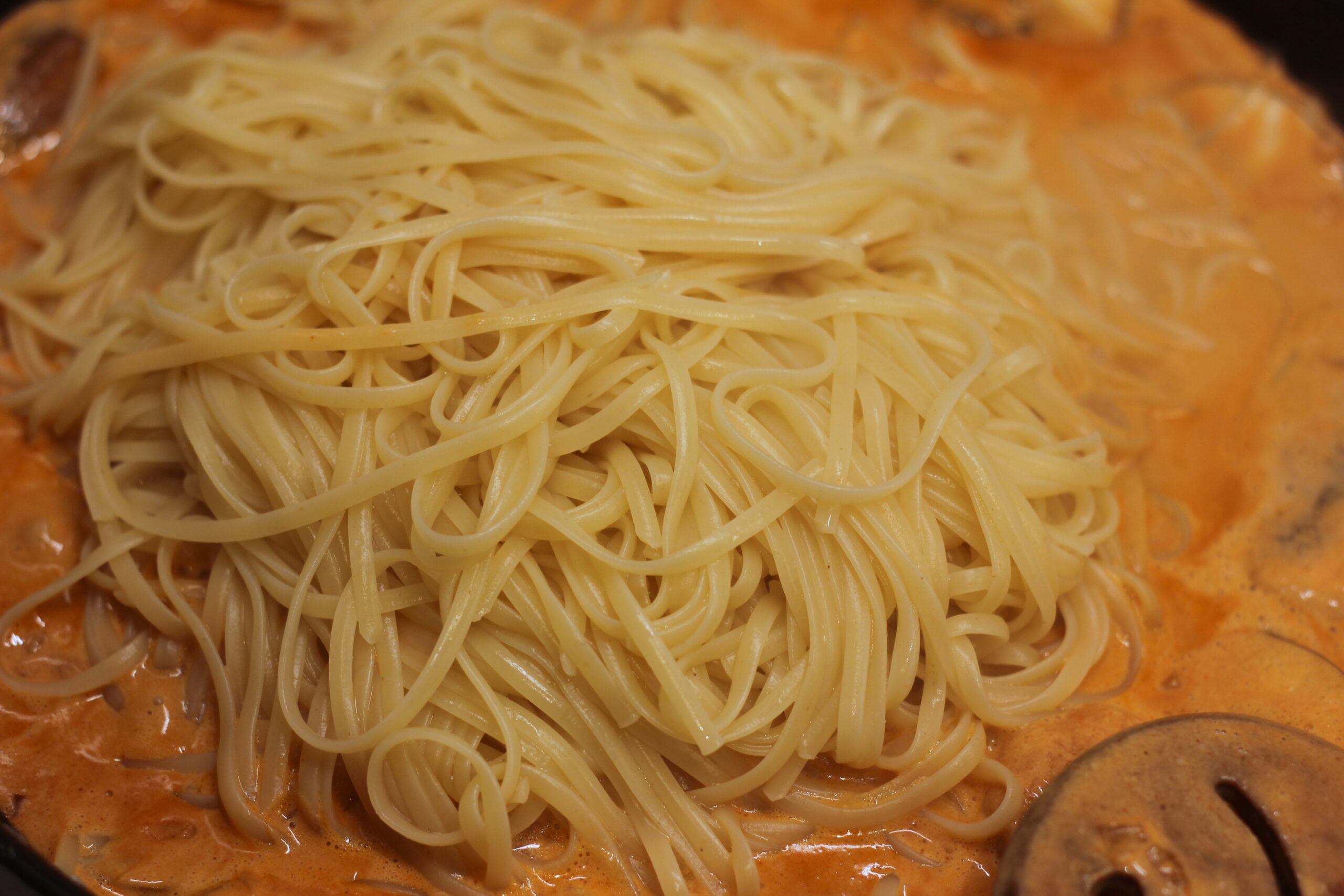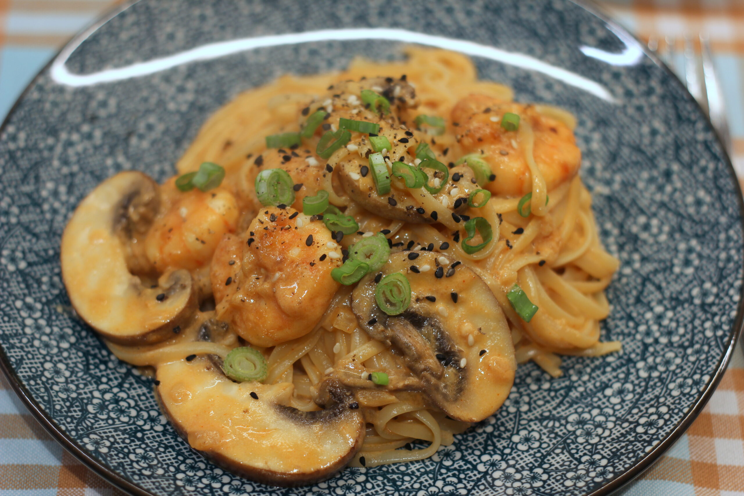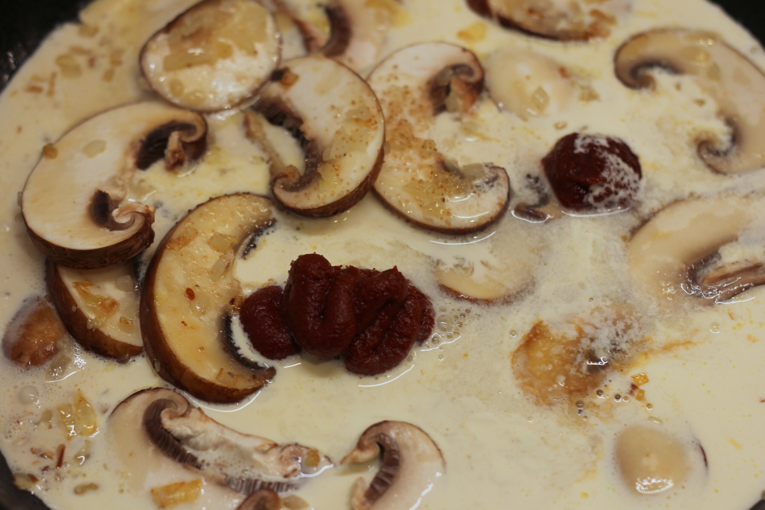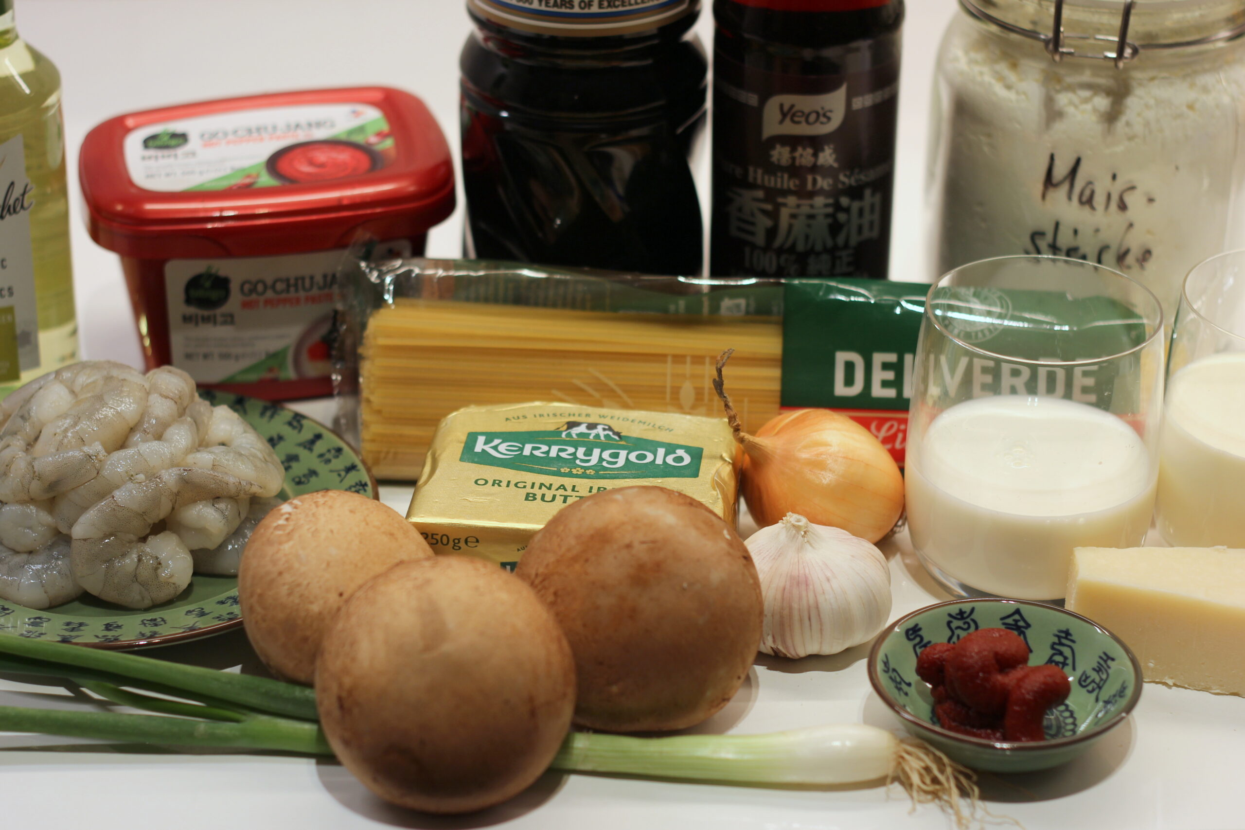 in der selben Pfanne die Butter schmelzen und Zwiebeln und Knoblauch glasig dünsten. Sahne, Milch, Gochujang, Tomatenmark, Sojasauce, Weißwein und Zucker einrühren. Etwa 7 Minuten köcheln lassen, dann die Garnelen wieder hinzugeben und den Parmesan unterrühren. Mit Salz und Pfeffer abschmecken.