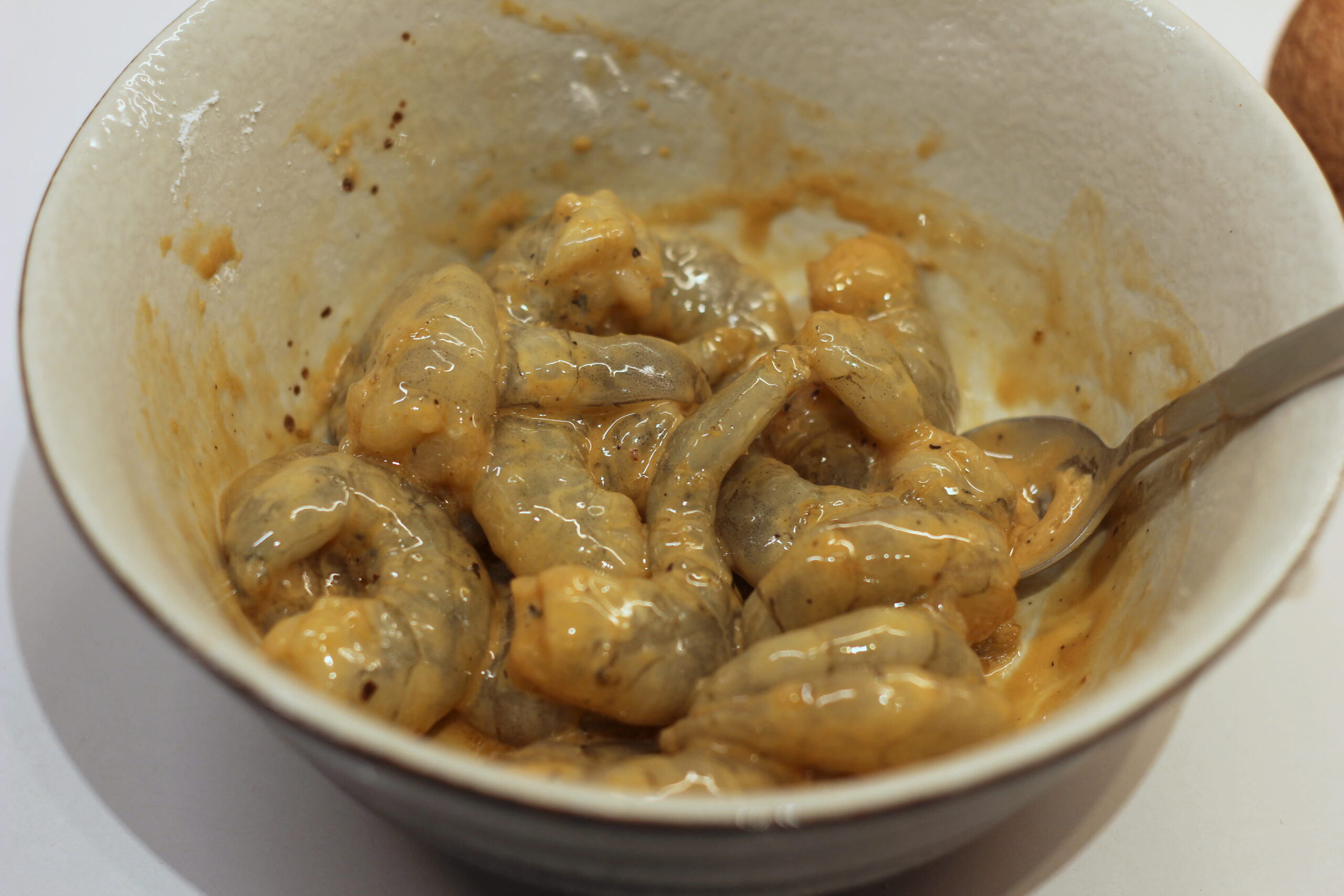 In einer Schüssel Garnelen mit Sojasauce, Sesamöl, Speisestärke und Pfeffer mischen und 10 Minuten ziehen lassen.