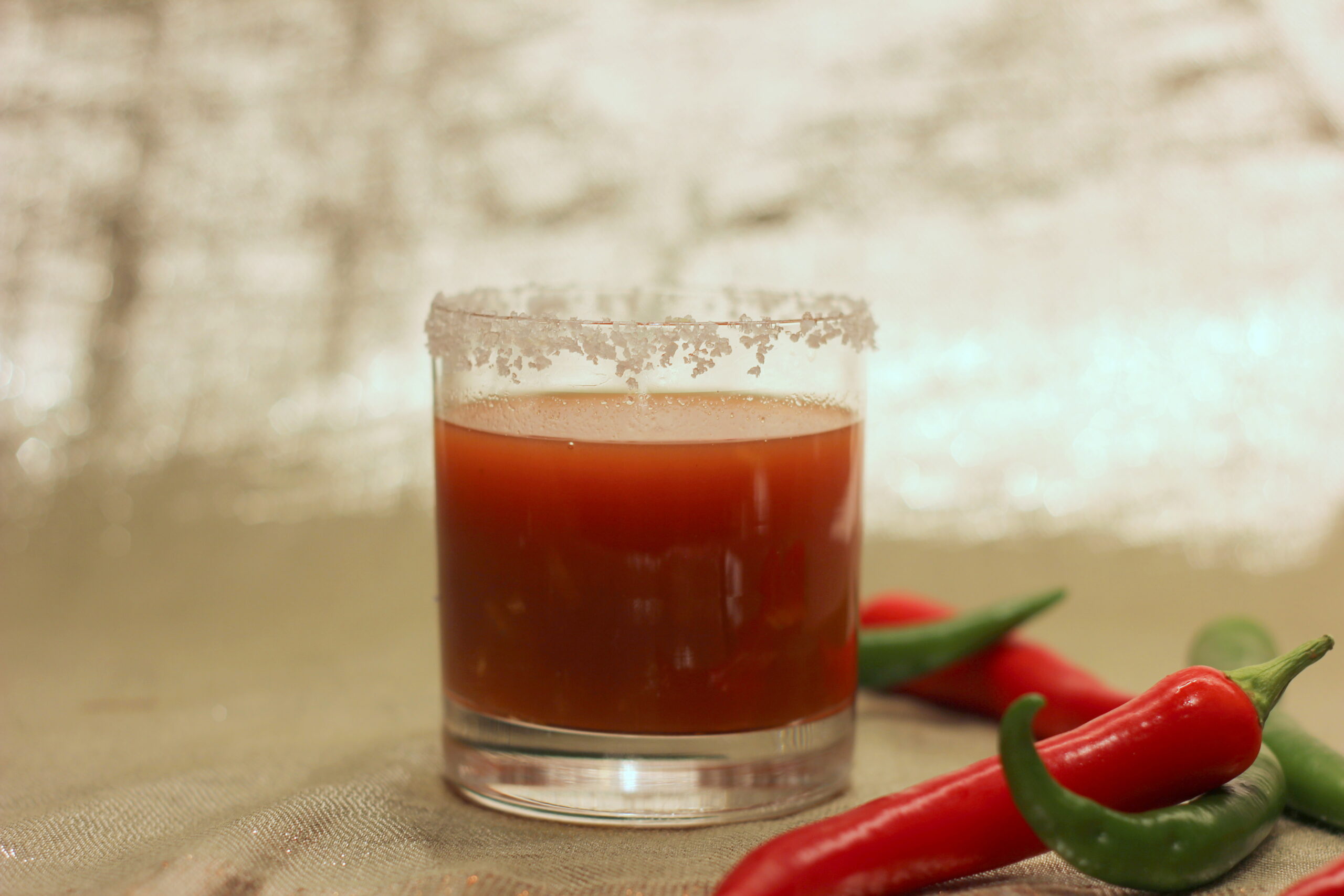 Den Rand eines Glases* mit Limette befeuchten und in Salz dippen. Alle Zutaten bis auf das Salz hineingeben und verrühren.